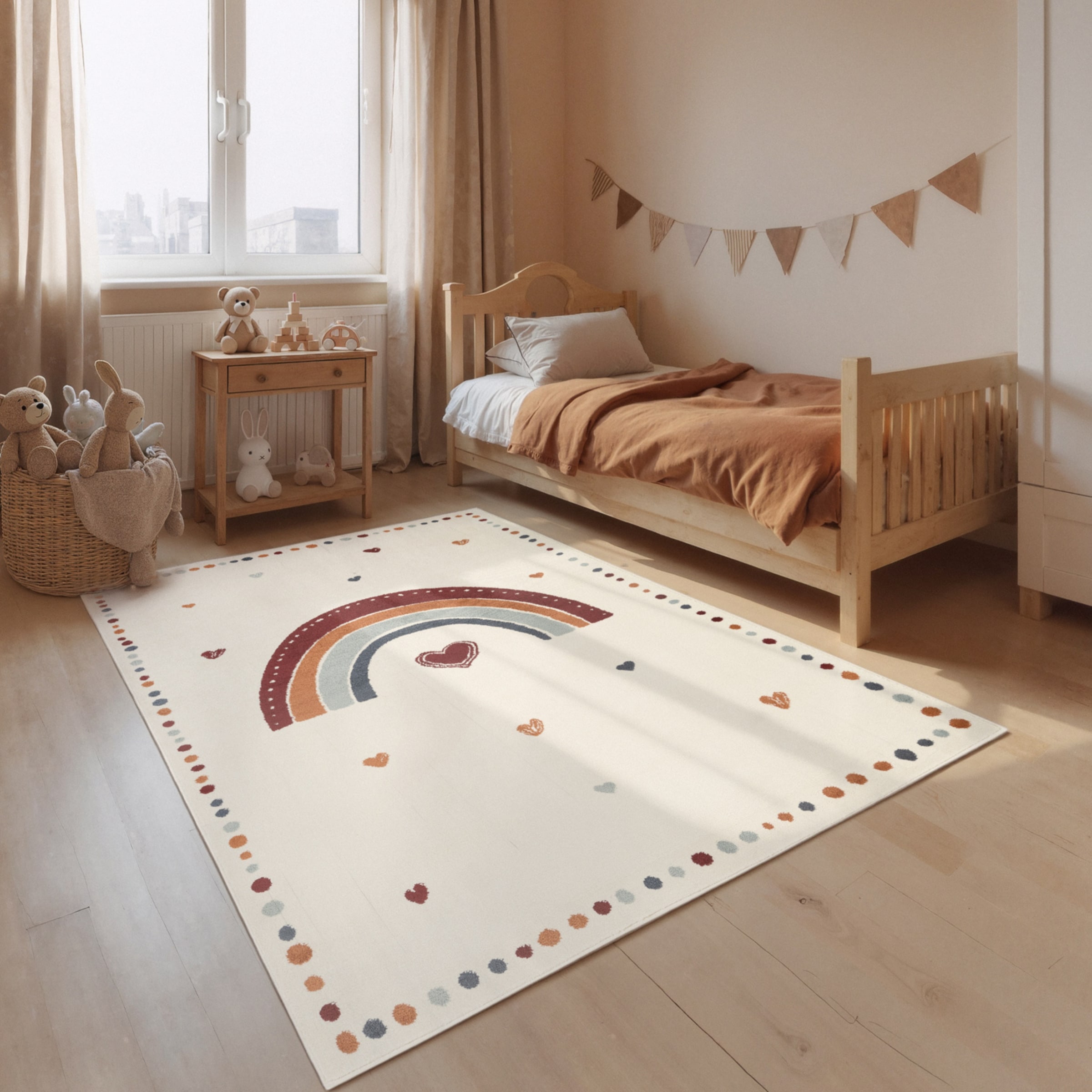 Ist Ihr Kind schon etwas älter, sollte sich das auch im Teppich-Design niederschlagen. Hier sind neutrale Teppiche die bessere Wahl. Verzichten Sie auf quietschbunte Muster und wählen Sie stattdessen unaufgeregte Designs mit Streifen, Polka Dots oder kleinen Herzen oder Sternen.