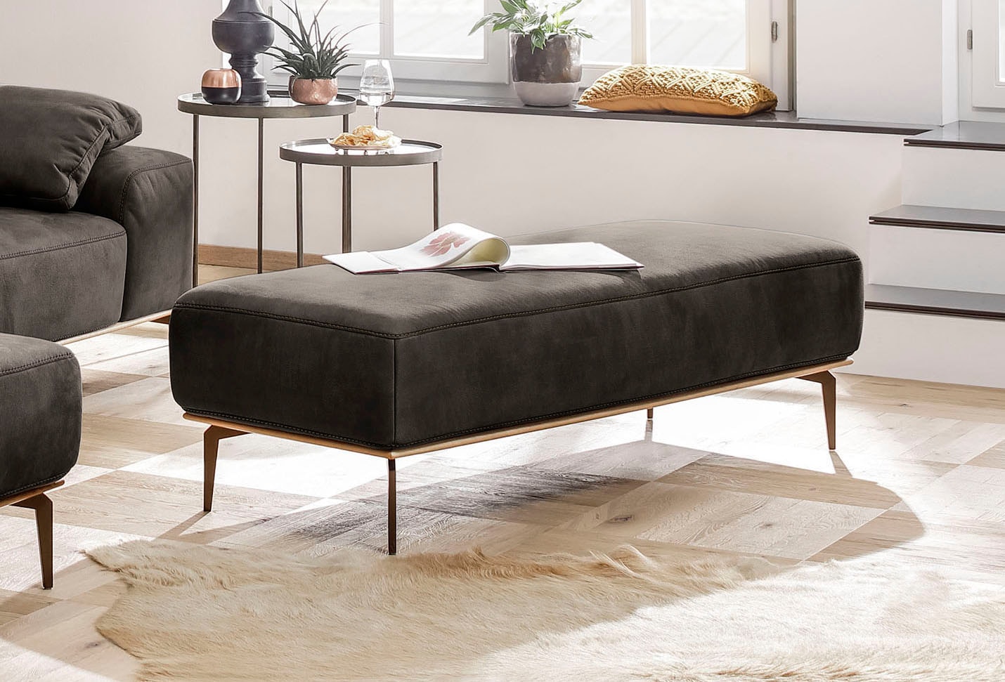 Polsterhocker »run« mit elegantem Holzsockel, Füße in Bronze pulverbeschichtet, Breite 150 cm
