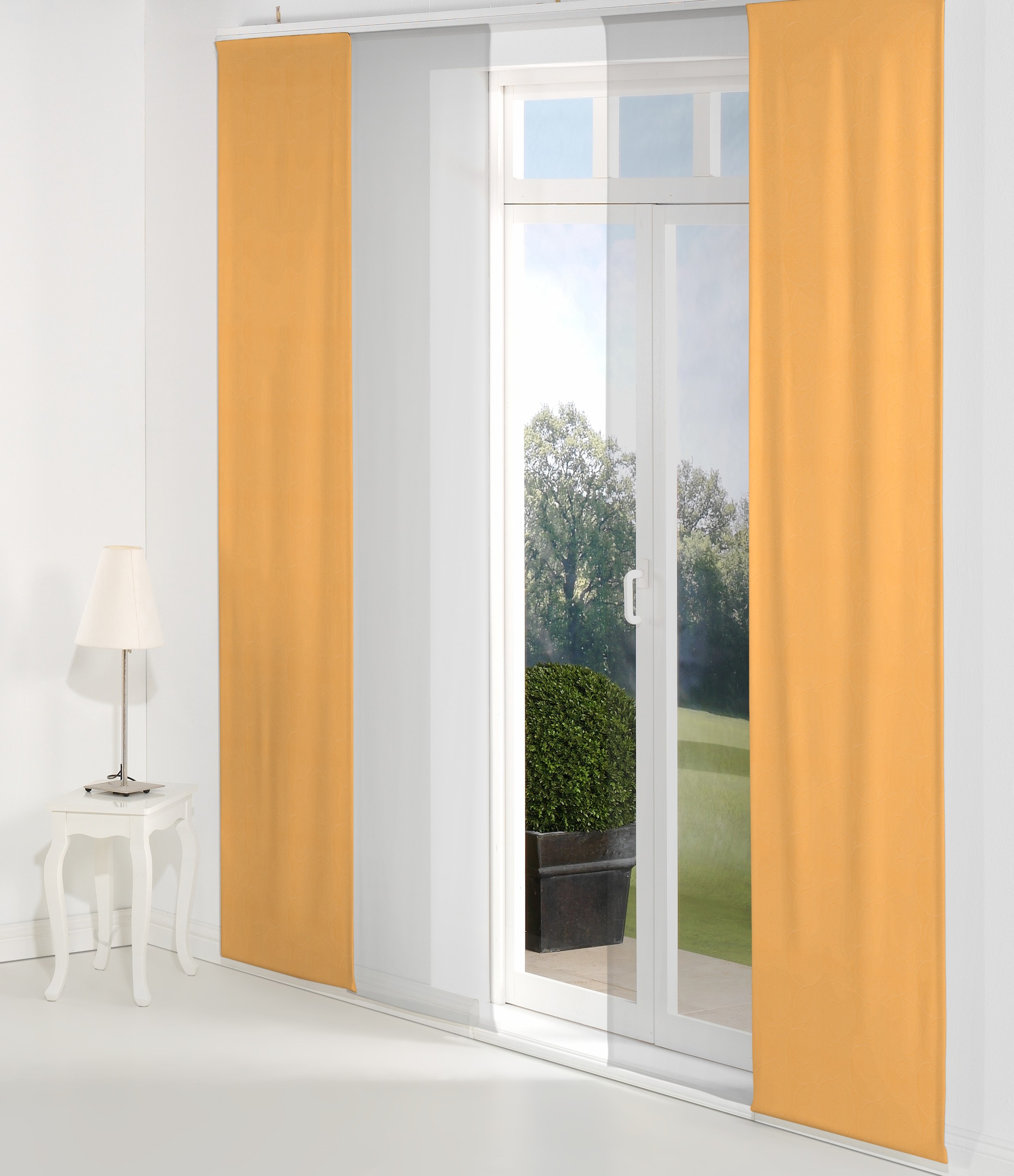 Hinweis Dekoration | Die angegebenen Maße sind die fertig dekorierten Maße.;Eine Schiebegardine ist eine schmale, glatt hängende Stoffbahn, die sich sowohl als Sichtschutz als auch zur Raumteilung eignet. Durch die Schiebetechnik sind Schiebegardinen sehr flexibel einsetzbar. |