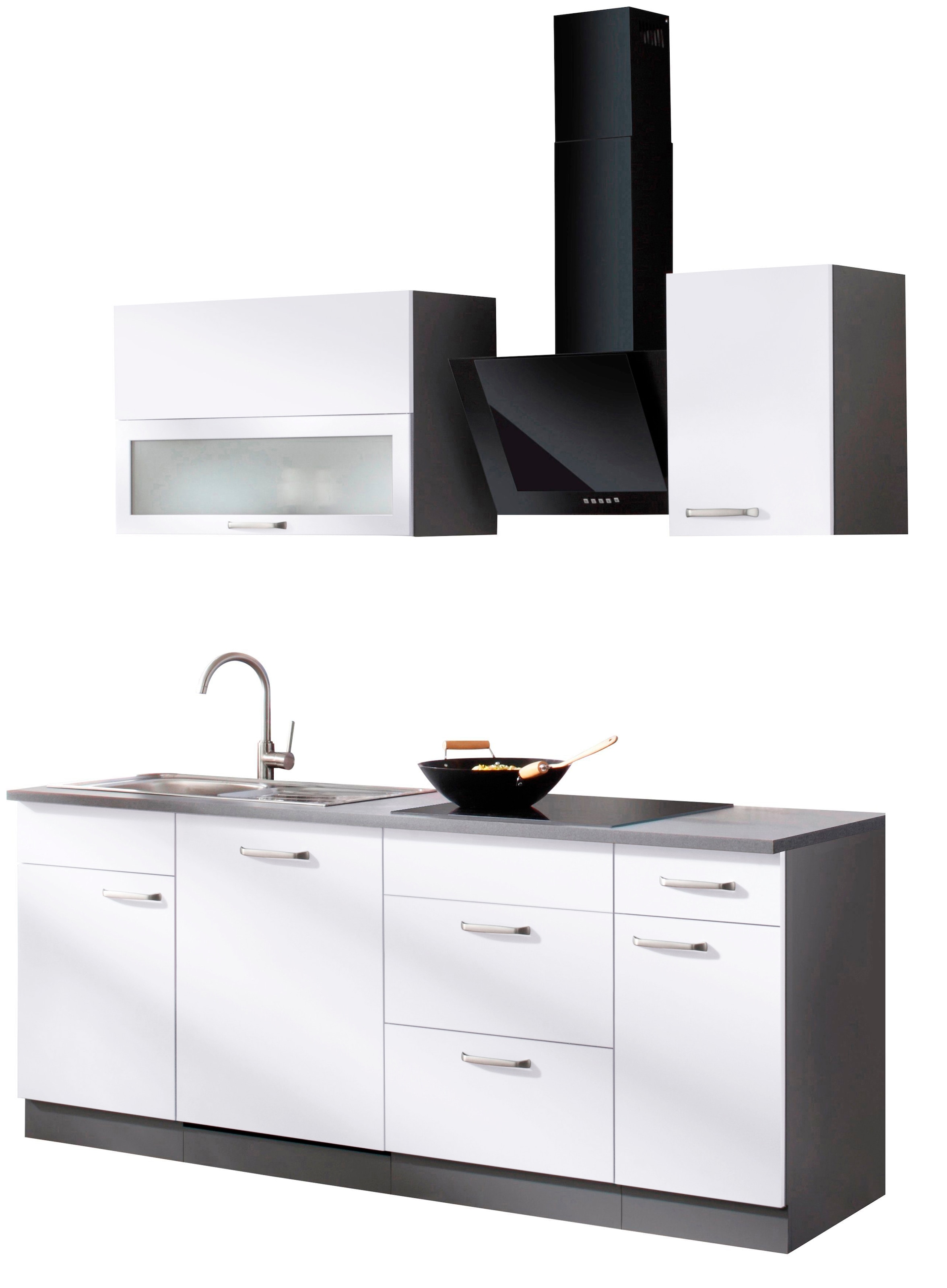 Wissenswertes | Produktdetails Gesamtbreite: 200 cm Arbeitsplattenmaterial: Spanplatte melaminbeschichtet Frontmaterial: Holzwerkstoff melaminbeschichtet Frontstruktur: perlstruktur Korpusdekor: grau Korpusmaterial: Holzwerkstoff melaminbeschichtet Sockelhöhe: 10 cm Sockel nicht verstellbar Set bestehend aus: Dunstabzugshaube, Kochfeld, Kochfeldunterschrank, Arbeitsplatte, Spülenschrank, Spüle, Hängeschrank Setdetails Hängeschrank Maße (B/T/H): 40/35/56,5 cm Anzahl Türen: 1 Anzahl Einlegeböden: 1 Hängeschrank Art: Faltlifthängeschrank Maße (B/T/H): 90/35/56,5 cm Anzahl Klappen: 2 Anzahl Fächer: 1 Kochfeldunterschrank Maße (B/T/H): 60/57/82 cm Anzahl Auszüge: 2 Auszugsinnenmaß (B/T/H): 53/38/7 cm Unterschrank Türanschlag: wechselbar Maße (B/T/H): 40/57/82 cm Anzahl Türen: 1 Anzahl Schubladen: 1 Schubkasteninnenmaß (B/T/H): 43/38/7 cm Anzahl Einlegeböden: 1 Spülenschrank Anzahl Türen: 1 Spülenmaße: B 86 / T 43,5 cm Maße (B/T/H): 50/57/82 cm Spüle: Edelstahlspüle Belastbarkeit: