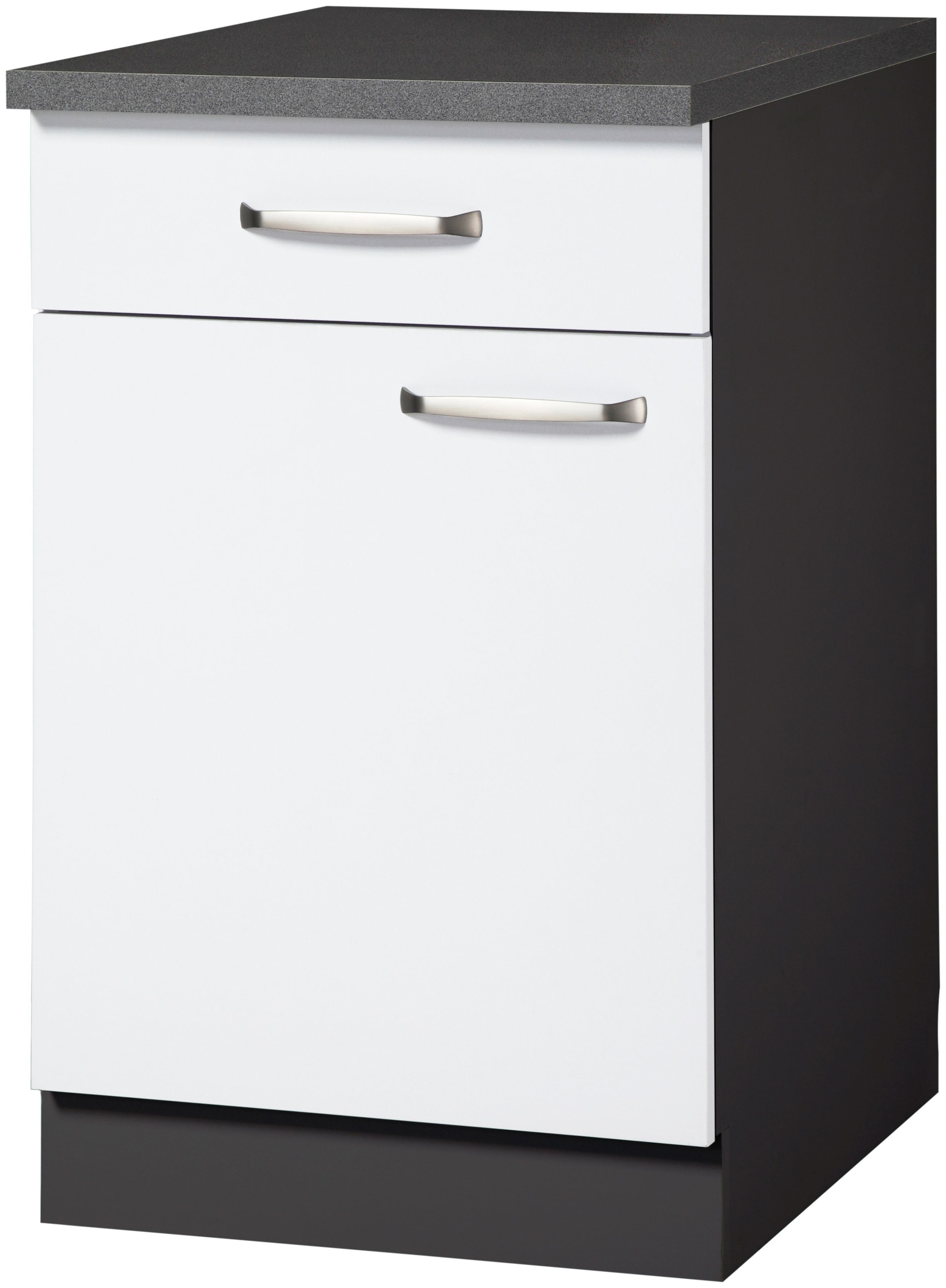 Farbbezeichnung | Front: Weiß, Korpus: Anthrazit, Arbeitsplatte: Granit Grau |