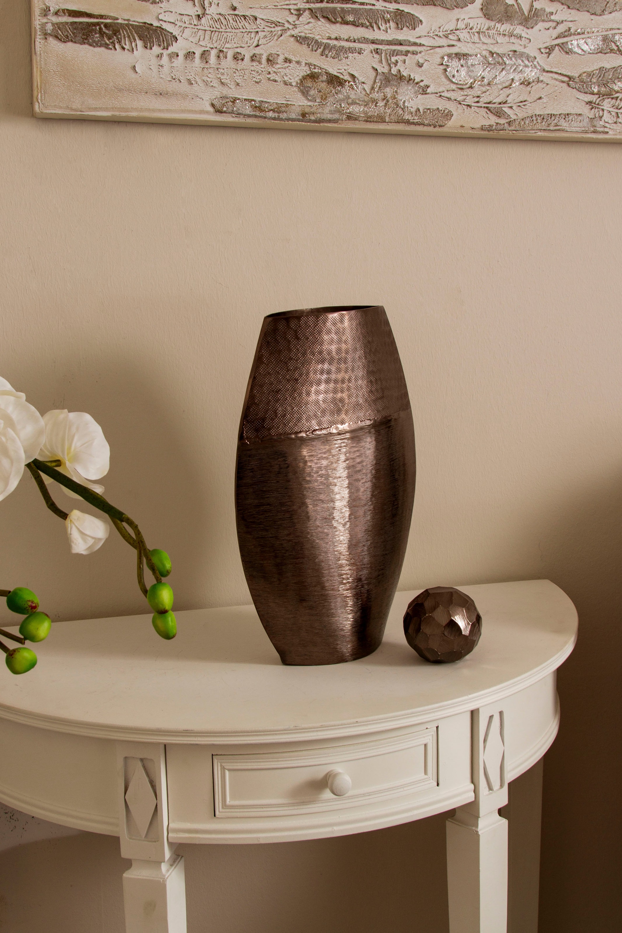 Die formschöne Dekovase von Home affaire verleiht deinem Zuhause ein elegantes Erscheinungsbild. Sie ist im modernen Stil gefertigt und überzeugt durch ihre geschmackvolle Struktur. Durch die unifarbene Gestaltung und die leicht bauchige Form fügt sie sich harmonisch in deinen individuellen Einrichtungsstil ein. Du kannst darin frische Blüten oder Zweige platzieren. Einen tollen Blickfang stellt die dekorative Vase auf dem Esstisch oder einem Beistelltisch im Wohnzimmer dar. Im Eingangsbereich kommt sie ebenfalls toll zur Geltung. Bei Bedarf kannst du die Aluminiumvase feucht abwischen. Mit der formschönen Dekovase von Home affaire sorgst du in jedem Raum für wohnliches Flair.