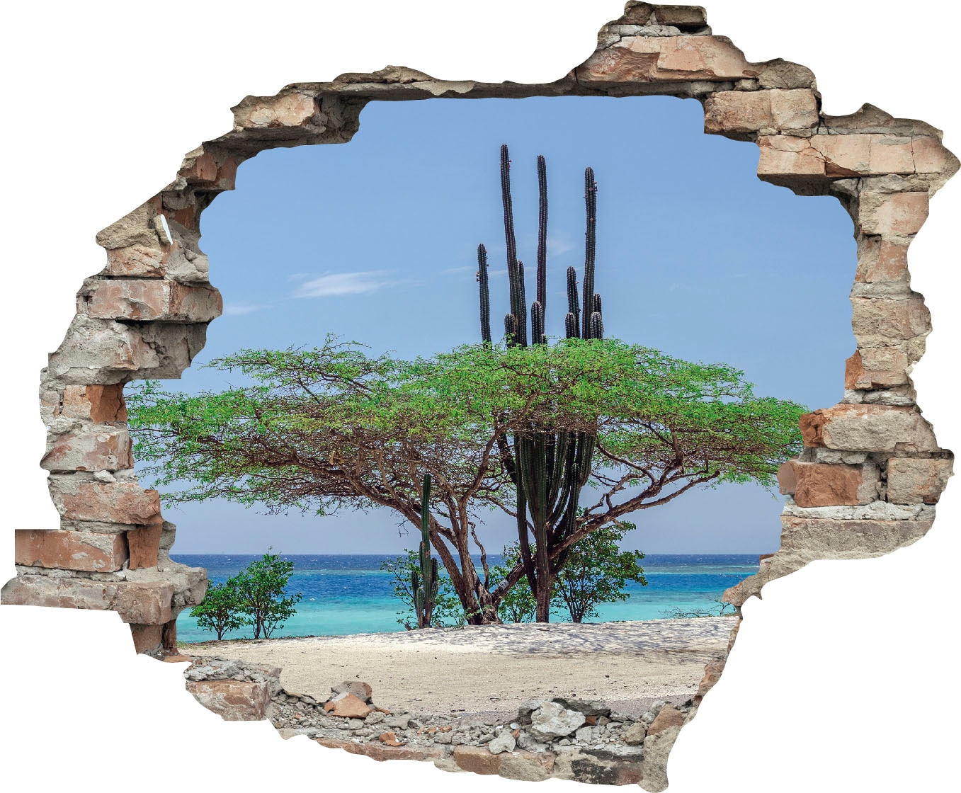 - Das Design des 3D-Wandtattoos illustriert ein Fenster in einer Wand, wodurch der Blick auf das eigentliche Motiv freigelegt wird.