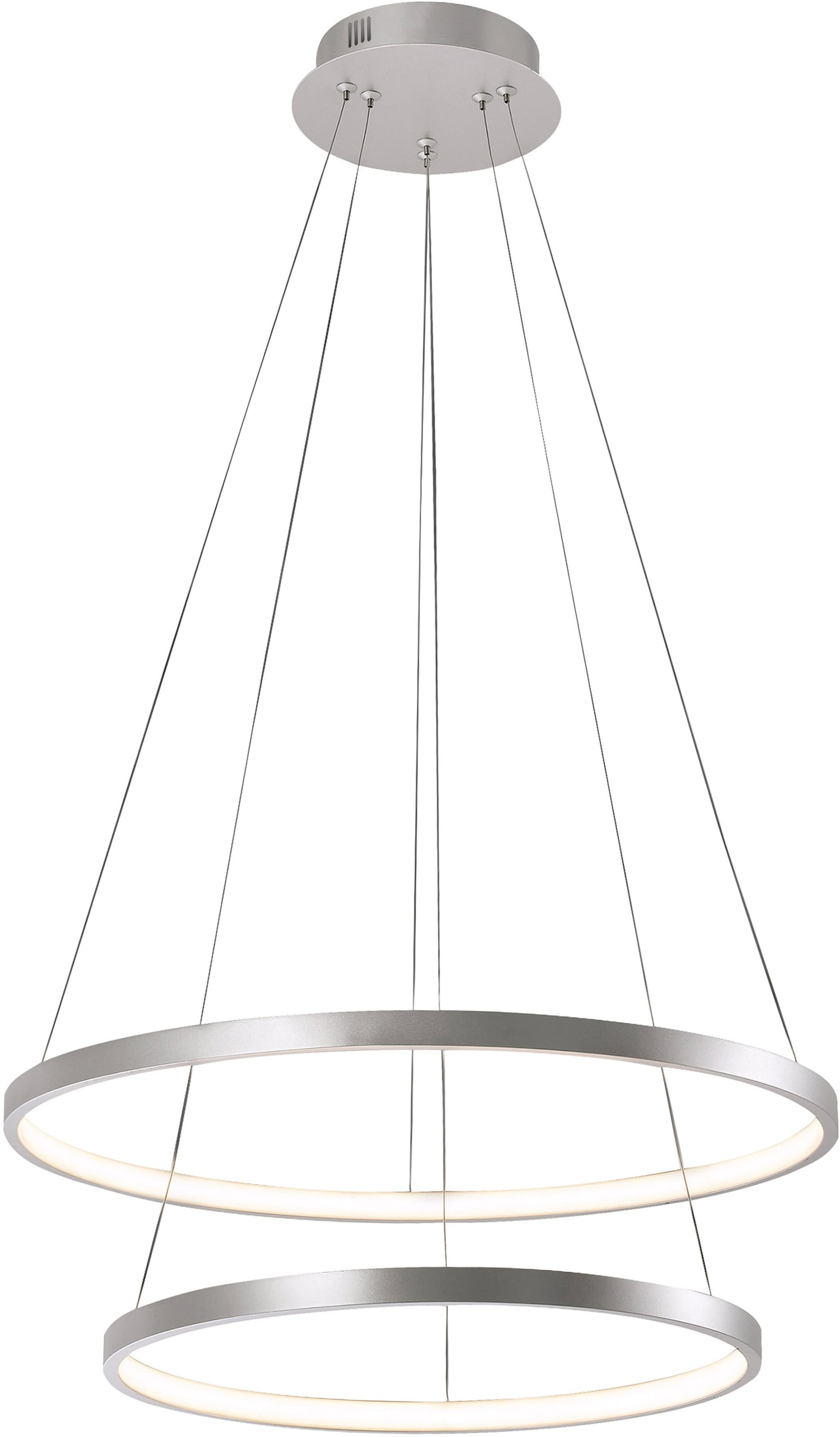 Die kreisrunde LED Pendelleuchte CIRCLE überzeugt mit einem modernen Design. Die LED Pendellampe gibt durch die zwei Leuchtringe, die jeweils mit einem festverbauten LED Board versehen sind, ein blendfreies, warmweißes Licht wieder. Die schöne silberfarbige Lackierung verleiht der Leuchte einen edlen Charme. Platziert über einen Esstisch sorgt die Hängelampe für eine gemütliche Atmosphäre und überzeugt dabei mit einem geringen Energieverbrauch und einer langen Lebensdauer.