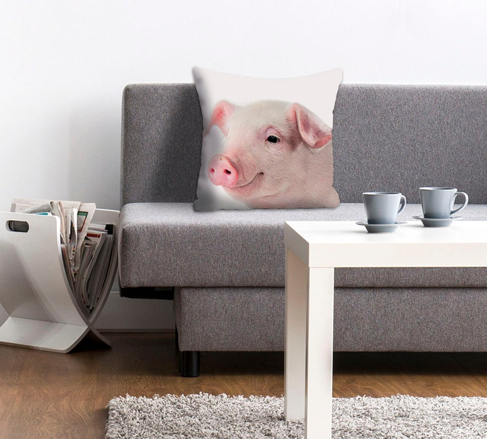 Die Kissenhülle "Rebecca" besticht durch das süße Schweinchenmotiv auf weißem Grund. Mit ihrer auffälligen Optik wird die Dekokissenhülle zum Blickfang auf dem Sofa, Sessel und der Sitzbank. Hergestellt aus einem weichen Material, fühlt sie sich kuschelig an und unterstützt eine behagliche Atmosphäre. Der dekorative Kissenbezug ist für ein schnelles Ab- und Aufziehen mit einem praktischen Reißverschluss versehen. Bei Bedarf lässt sich die Dekohülle unkompliziert waschen.