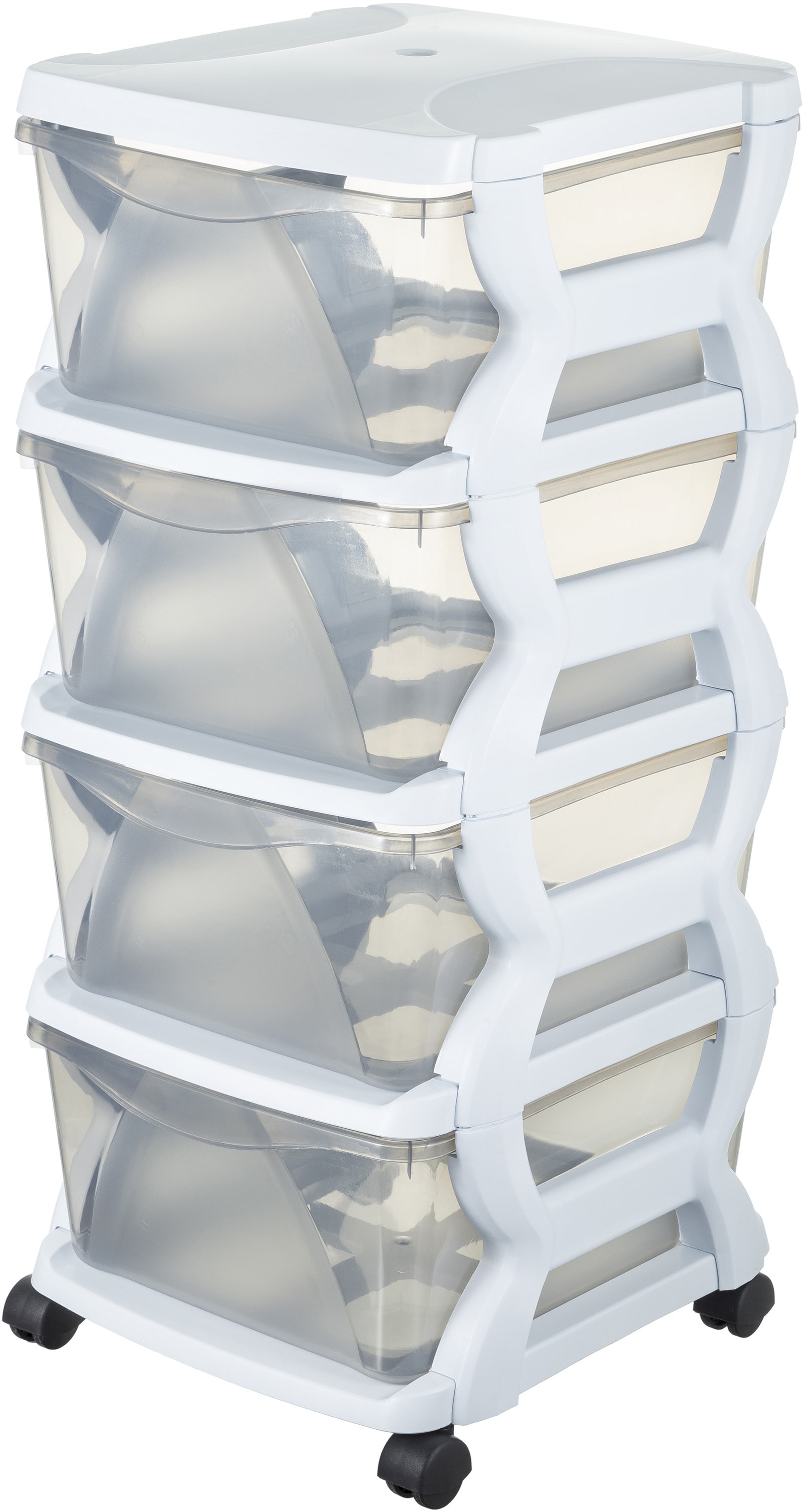Vielseitig einsetzbar: Der Rollcontainer INSIEME im modernen Design bietet reichlich Stauraum. Er ist aus hochwertigen Kunststoff mit vier übereinander angeordneten Aufbewahrungsboxen mit je 43,8 l Fassungsvermögen ausgestattet und bietet damit jede Menge Stauraum. Dank der Rollen lässt sich der Container leicht von Raum zu Raum bewegen. Wahlweise lässt er sich als Aufbewahrungsmöglichkeit für Konserven und Küchenutensilien in der Küche, als flexibel einsetzbares Badezimmermöbel oder zur Aufbewahrung von Spielzeug im Kinderzimmer verwenden.