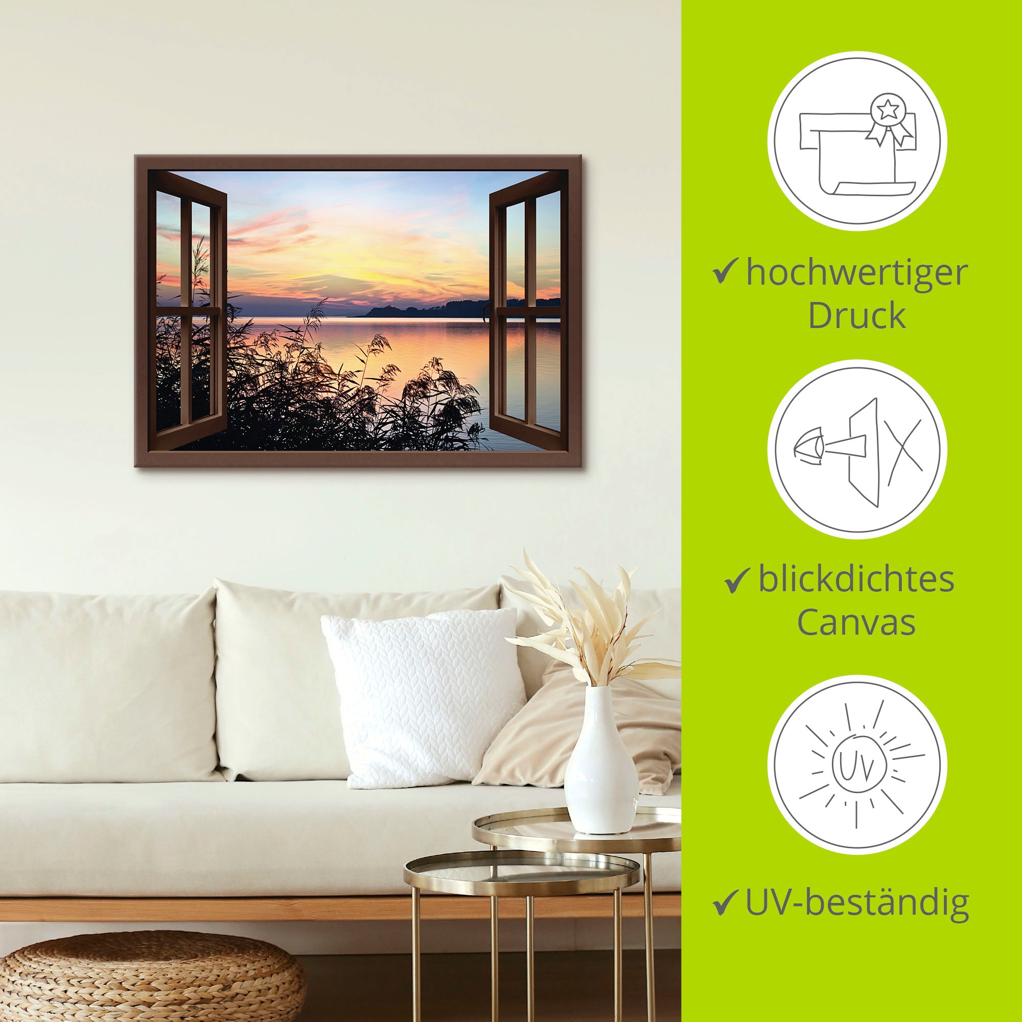 Mit viel Liebe für kunstvolles Wohnen verleiht unser Poster mit dem Motiv "Fensterblick - Abendrot im Schilf" von Perry Deinem Zuhause Charakter. Es begeistert durch hochauflösende Druckqualität und hochwertige Materialien – Made in Germany.