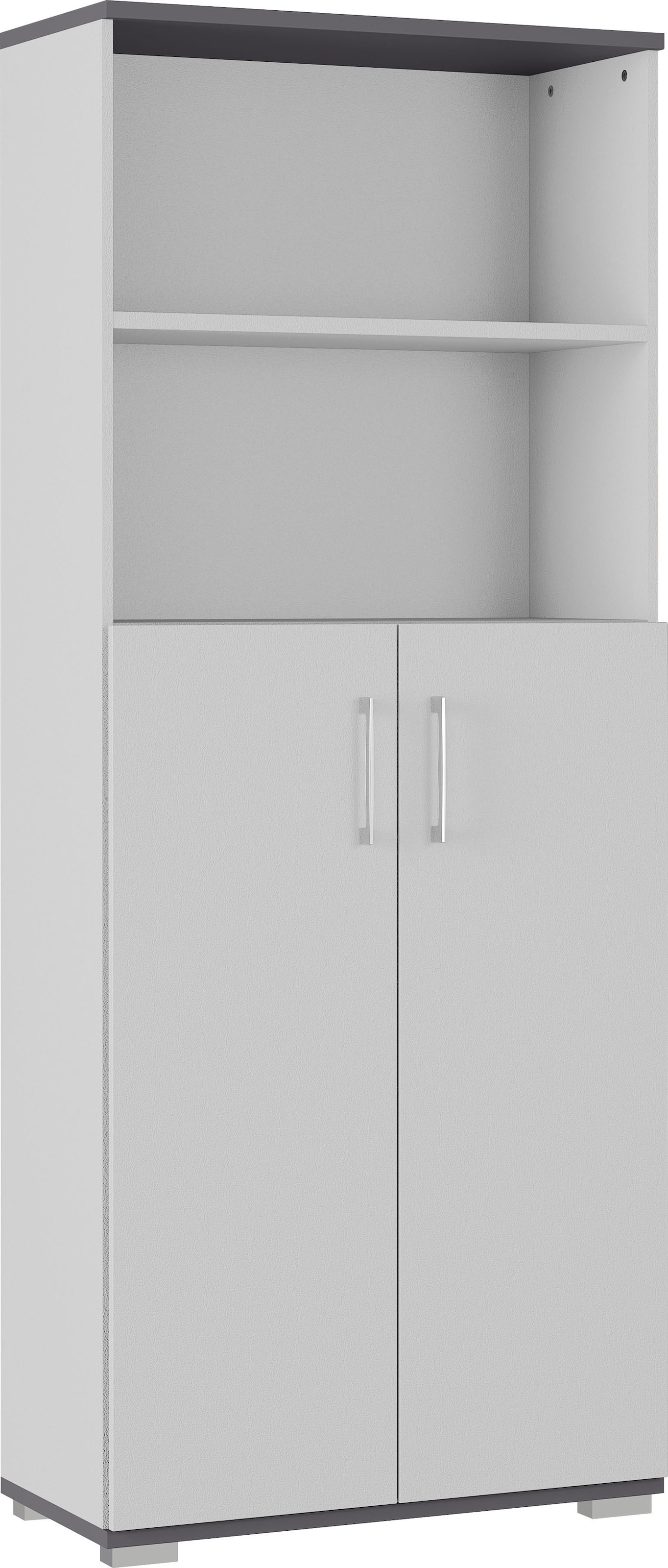 Aktenschrank mit zwei Türen, dahinter zwei Einlegeböden (jeweils belastbar bis zu 22 kg) sodass drei Fächer in Ordnerhöhe entstehen und zwei offenen Fächer (jeweils belastbar bis zu 22 kg); Unterboden bis zu 30 kg belastbar; zwei Bügelgriffe und vier Kunststofffüße; Melaminharzbeschichtung, ABS-Kanten, Made in Germany.