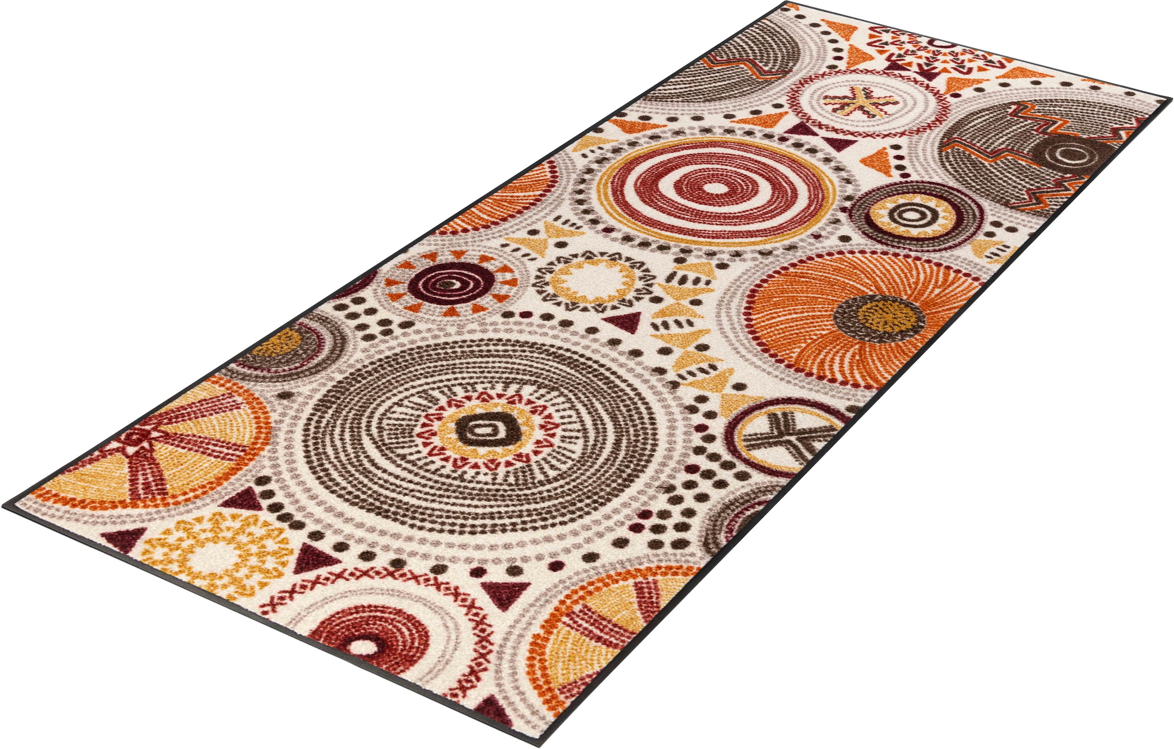Die Designserie Boho Style befasst sich, wie es der Name schon sagt, mit dem sogenannten Boho- Style. Ethnisch inspiriert aber modern interpretiert. Verschiedene Größe und Formen können in dieser Serie miteinander kombiniert werden. Die warmen Erdtöne auf dem hellen Grund wirken freundlich und leicht. Zusätzlich passen die wash+dry Uni Farben Burnt Orange, Hone Gold und Brown bestens dazu. Individuell einsetzbar als klassische Fußmatte vor dem Eingang, als Eyecatcher in Flur oder Garderobe, aber auch auf Balkonen, Terrassen und in Wintergärten sind die ?wash+dry?-Matten ein optisches Highlight und nützlicher Helfer zugleich. Neben dem dekorativen Aspekt kommt bei allen wash+dry Matten die Funktion nicht zu kurz. Zuverlässig nimmt der flache, dichte Flor aus Polyamid Schmutz und Feuchtigkeit auch in hoch frequentierten Bereichen auf. Die rutschhemmende Rückenbeschichtung aus Nitrilgummi sorgt für sicheren Stand. Aufgrund von Farbechtheit und Formstabilität kann die Matte einfach in der Waschmaschine und auch im Trockner gereinigt werden, um die jahrelange Freude an der Matte zu gewährleisten. Für die tägliche Reinigung ist der Teppich leicht zu saugen und auch für den Saugroboter geeignet, da der Flor sehr flach ist. Der Teppich ist 100% PVC-frei. Die Serie gibt es in den Größen 50/75cm, 75/120cm und 75/190cm sowie in zwei runden Größen.