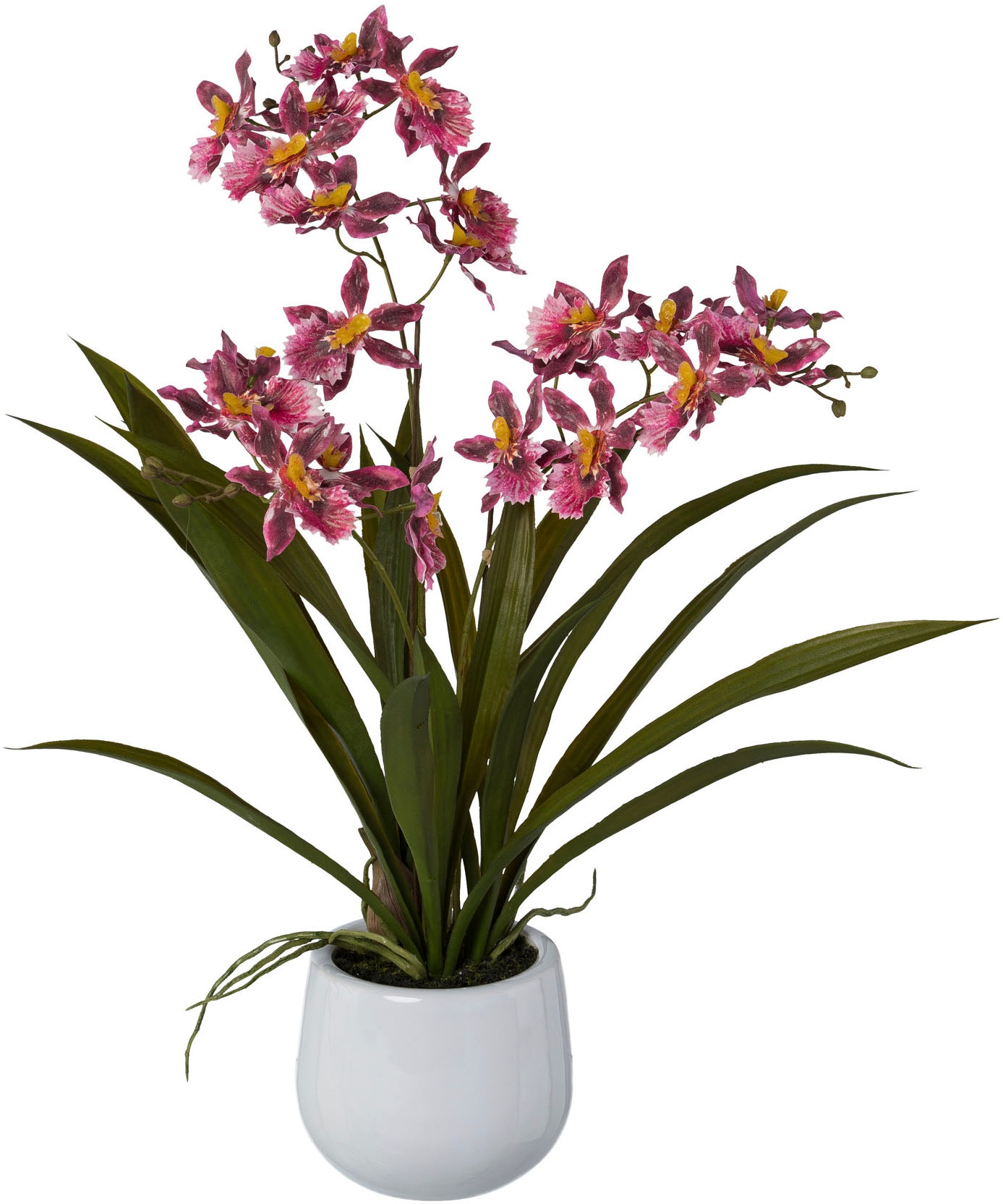 Stilvoll und dekorativ präsentiert sich diese prächtige Orchidee Gambia. Die Orchideen-Nachbildung besticht vor allem durch ihr blütenreiches und feingearbeitetes Aussehen - liebevoll und detailgetreu der Natur nachempfunden ist sie nur auf den zweiten Blick vom Original zu unterscheiden. Zeitlos in einem formschönen Topf aus hochwertiger Keramik wird diese pflegeleichte Gambia-Orchidee zu einem echten Blickfang und setzt ein geschmackvolles Statement in Ihrem Ambiente. Ob auf Ihrer Kommode oder im Empfangsbereich - dieser Blütentraum zaubert eine trendige Atmosphäre in Ihre Räumlichkeiten. Auch eine tolle Geschenkidee!