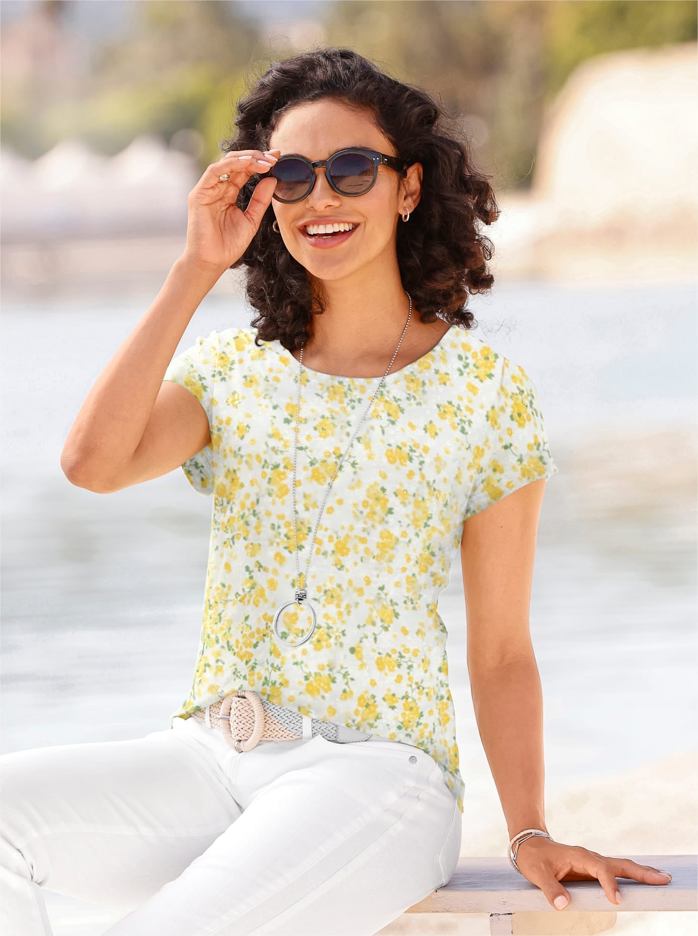 Weiches Single-Jersey Shirt mit Blüten-Druck. Die modern überschnittenen Schultern sind umgeschlagen und fixiert. 100% Baumwolle. Maschinenwäsche.