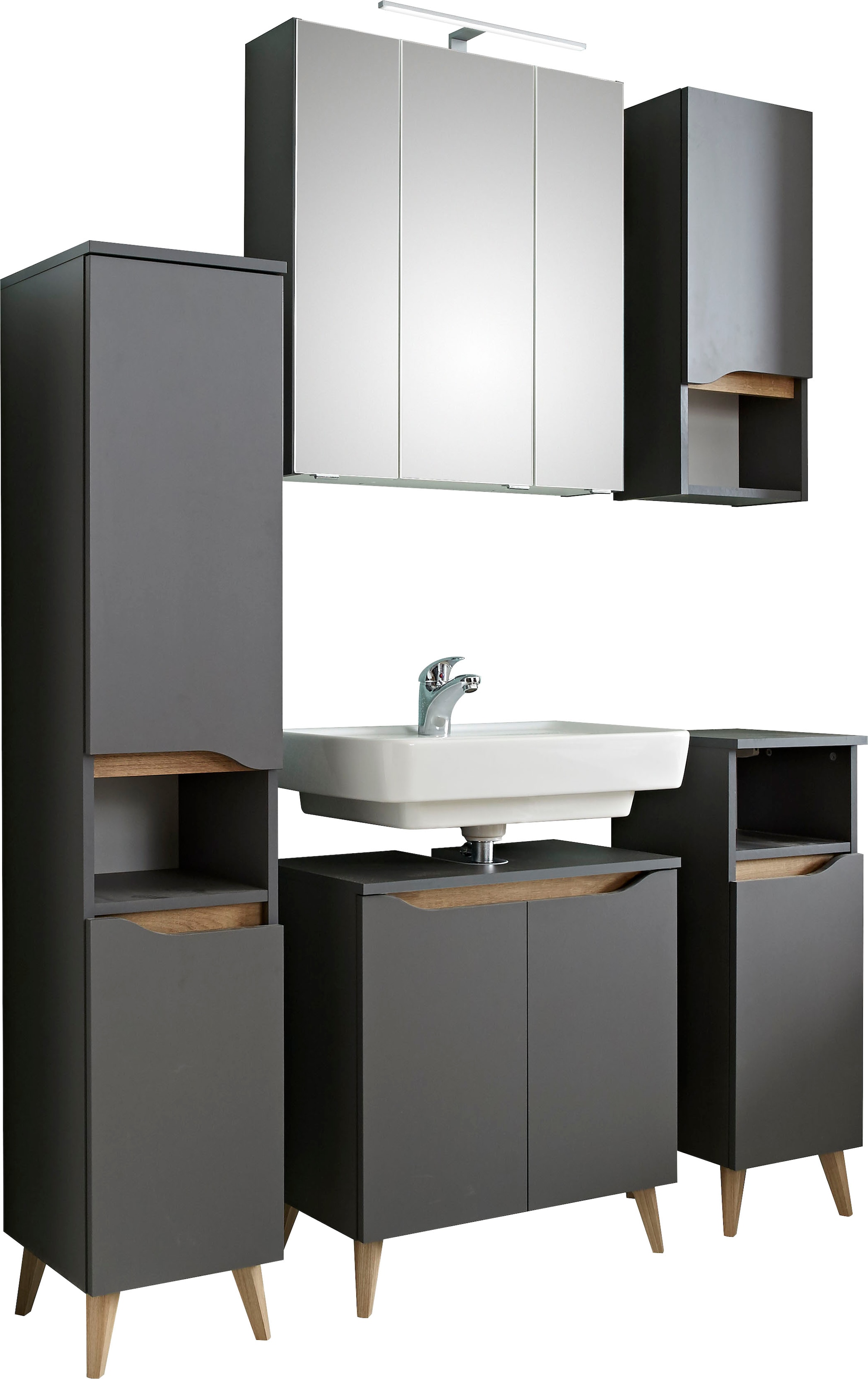 - Badezimmer Möbel Set bestehend aus Keramikwaschtisch, Waschtischunterschrank, Spiegelschrank inkl. LED-Aufsatzleuchte und Midischrank für extra Stauraum in Ihrem Bad.