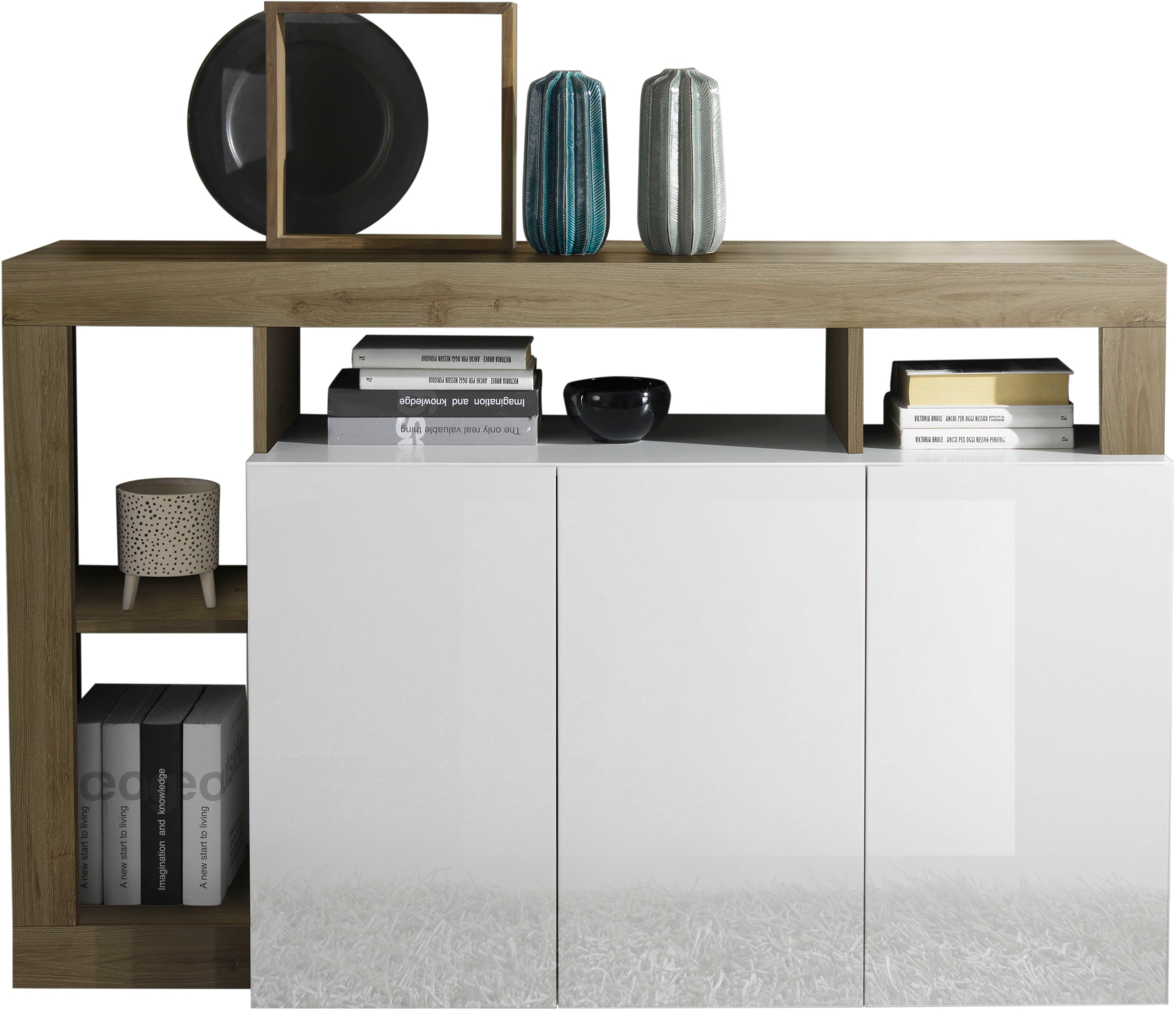 Wissenswertes | mit farbigem Aufsatz/Rahmen;Maße B/T/H offene Fächer hinter den Blenden: 29/33/37,5 cm - 29/33/44 cm - 73,5/40/22,5 cm - 37/40/22,5 cm;Breite der Frontblenden vom Aufsatz/Rahmen 8 cm;Korpus weiß Melamin |