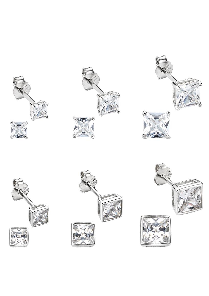 Funkelnde Ohrstecker für alle Gelegenheiten. Dieses Set enthält sechs Paare in drei unterschiedlichen Größen. Die quadratischen Stecker sind teilweise mit einer Zargenfassung und teilweise mit einer Krappenfassung versehen. Für das Funkeln sorgen die glitzernden Zirkonia (synth.).