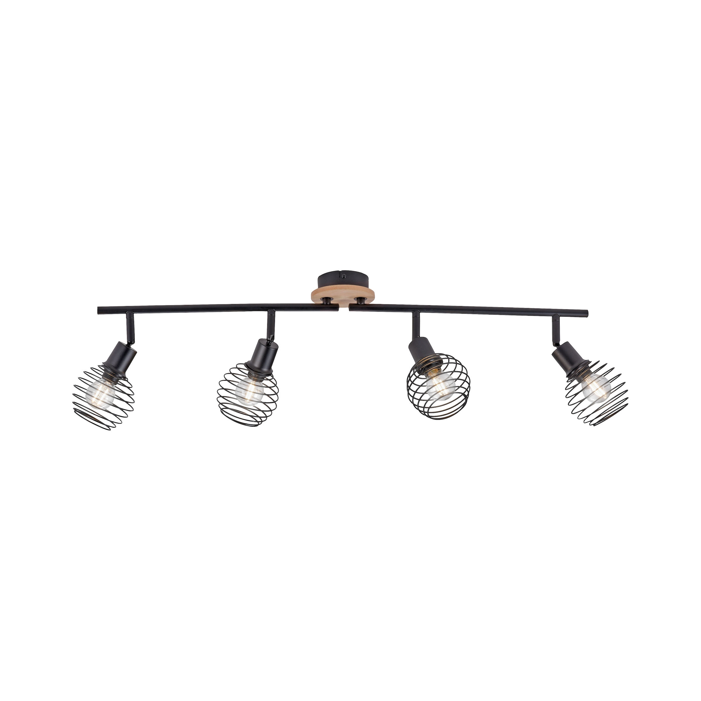 Die schwarze, fünfflammige Wand- und Deckenleuchte EUGEN erhält durch ihren abgesetzten Baldachin in Eichenholzdekor einen wohnlich-gemütlichen Touch. Die Spots können in unterschiedliche Richtungen geschwenkt und gedreht werden, wodurch auch große Räume erhellt werden können. Durch die offene gestalteten Leuchtenschirme hat man Sicht auf das Leuchtmittel, deshalb ist eine Bestückung mit Filament Leuchtmitteln mit E14 Fassung und max. 40 Watt optimal. Die Deckenleuchte kann mit ihrem Materialmix den verschiedensten Einrichtungsstilen kombiniert werden: von Vintage über Industrial.