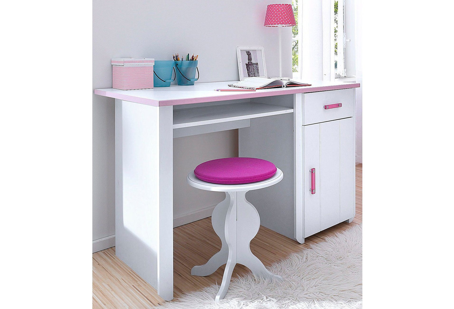 Wunderschönes Kinderzimmer in weiß mit rosafarbenen Elementen. Pflegeleichte Kunststoffoberfläche. Innendekor weiß. Rosafarbene Kunststoffgriffe.