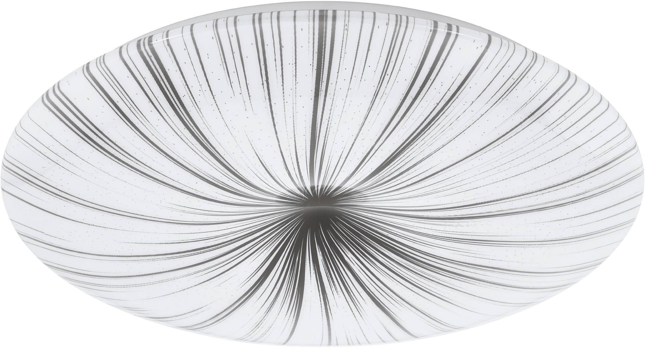 - Die LED Deckenleuchte aus Metall und einem Cover aus Kunststoff mit einem Muster in Weiß und Silber streut das Licht breit und angenehm in den Raum