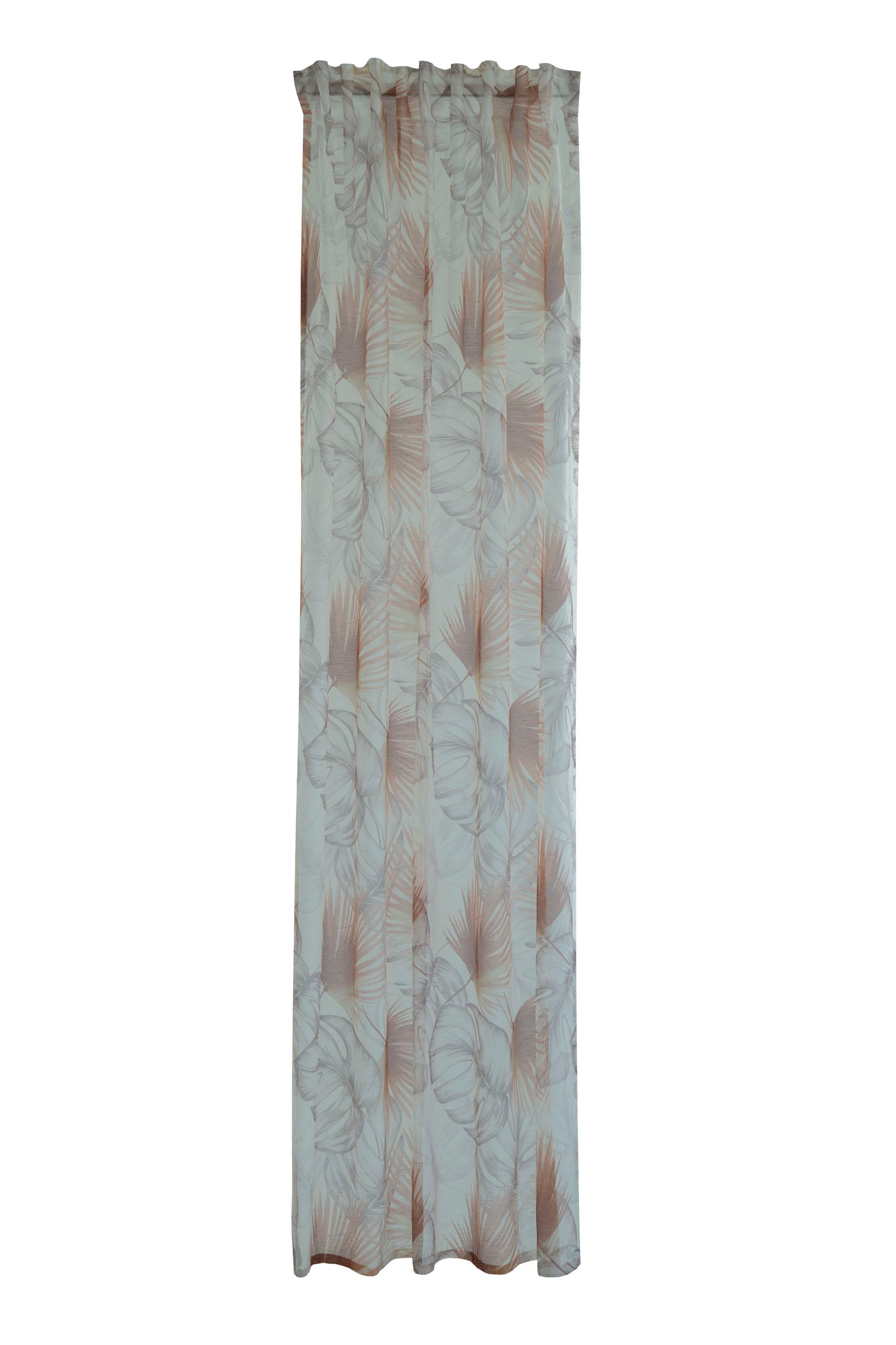Über den transparenten Fertigschal „Adeon“ von HOMING erstrecken sich dekorative großflächige Palmenblätter, die uns von entspannten Sommertagen träumen lassen. Die verdeckte Schlaufe wirkt unaufdringlich und dezent und lässt sich ideal mit Flächenvorhängen oder weiteren Dekostoffen und Plissees kombinieren.