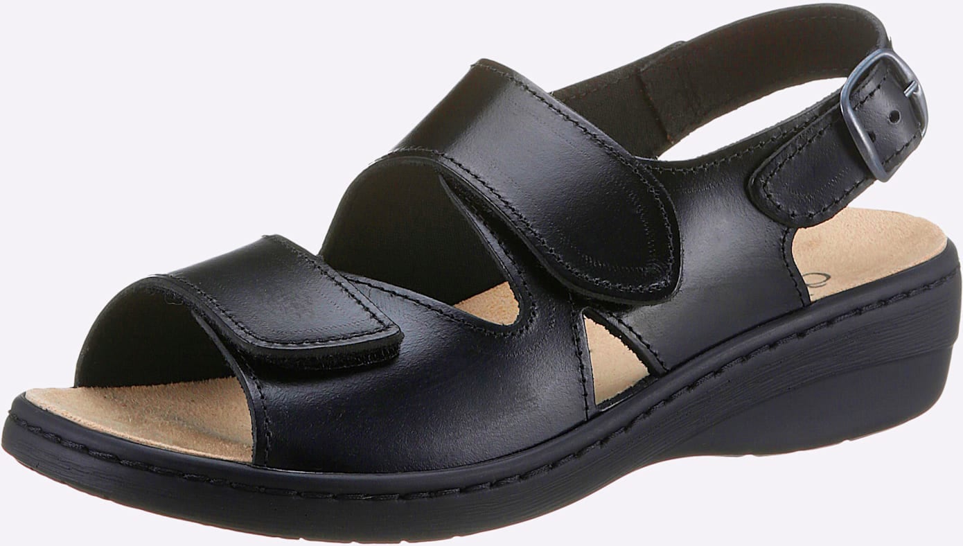 Sandalette von Airsoft mit weicher Polsterung – so laufen Sie wie auf Wolken. Aus Glattleder mit Microfaser-Innensohle. Praktisch mit Klettverschlüssen und Wechselfußbett. Flexible PU-Laufsohle mit ca. 35 mm Absatz. Weite H.