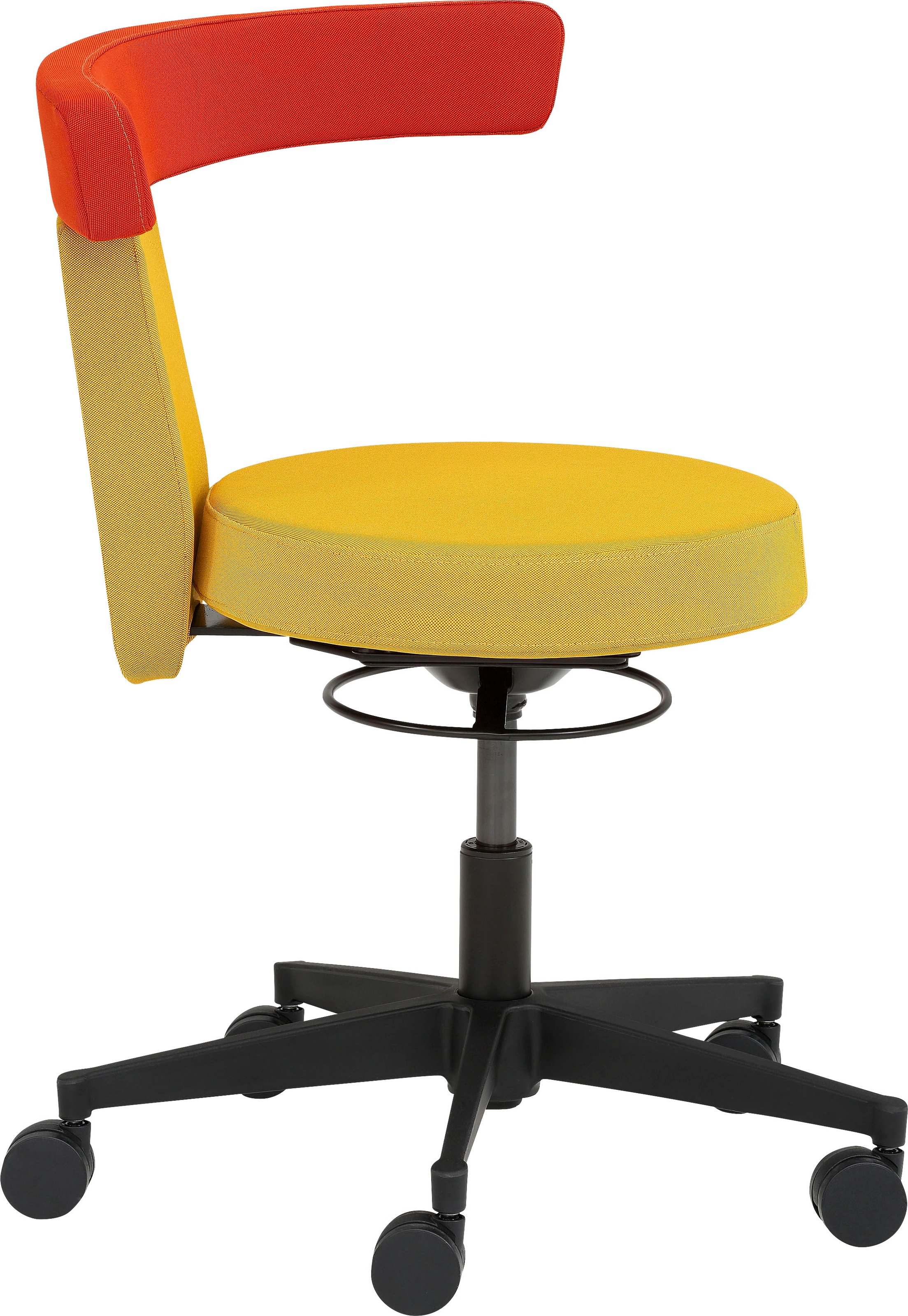 Wissenswertes | 100 % post-consumer recyceltes Polyester;Tellersitz und Rücken gepolstert;Rückenlehne/Armauflage 360° drehbar und höhenverstellbar;Rücken-Raster-Höhenverstellung;Polyamid-Fußkreuz schwarz (ø 61 cm) |
