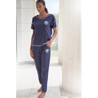 Schöner Schlafanzug von Vivance Dreams. Pyjamaoberteil mit Rundhalsausschnitt und süßem Frontprint. Lange Hose mit Streifen, seitlichen Eingriffstaschen und Tunnelzugbund. Softer Single-Jersey aus Baumwolle.