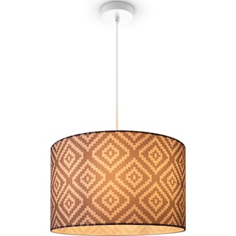 DIE LEUCHTE:Langweilig kann doch jeder! Mit dieser eleganten und frechen Pendelleuchte verpassen Sie Ihrem Lieblingszimmer ein ganz besonderes Highlight. In dezentem Weiß gehalten, kommt bei diesem Wohnaccessoire vor allem der hochwertige Stoffschirm groß raus, denn dieser ist mit einem modernen, abgerundeten Rautenmuster versehen und erstrahlt in angesagten Farbtönen wie Blau, Grau oder Pink. So zaubern Sie sich einen echten Eyecatcher nach Hause, der gleichzeitig auch noch ein sanftes Umgebungslicht bietet. Zur einfachen Montage ist der Schirm mit einem praktischen Klettverschluss versehen.Die Leuchte wird außerdem mit hochwertigen fischer® DUOPOWER Dübeln und Schrauben geliefert, die bestmöglichen Halt an jeder Decke garantieren. EIN DESIGN, DAS SICH SEHEN LASSEN KANN:Lassen die doch einfach den Anderen ihre eintönigen Wohnaccessoires und holen Sie sich lieber eine frische und lebendige Lichtquelle nach Hause, die Ihr Lieblingszimmer erleuchtet und dabei auch noch stilvoll und modern aussieht. Als trendiges Designobjekt passt die Leuchte ideal in die angesagtesten Inneneinrichtungen und sorgt im Handumdrehen für gute Laune und angenehm helles Umgebungslicht. Dank ihres Rautenmusters bietet die Leuchte außerdem verspielte Lichteffekte. Je nach Wahl des Leuchtmittels könne sie das Licht ganz nach Ihrem Geschmack variieren. In Verbindung mit einem dimmbaren Leuchtmittel und kompatiblem Dimmer, können Sie die Helligkeit je nach Wunsch und Gefühlslage an Ihre Bedürfnisse anpassen.TECHNISCHE DATEN: Pendelleuchte mit E27-Fassung, inklusive fischer® Dübel DUOPOWER, Schrauben, Gewicht: 0,83 Kg. 220-240 V, 50/60 Hz, Schutzklasse: I, Maximale Umgebungstemperatur:40°C, E27-Fassung, Empfohlene Leuchtmittelform: A60, Maximale Wattzahl: 25 W.Garantie Leuchte 5 Jahre.