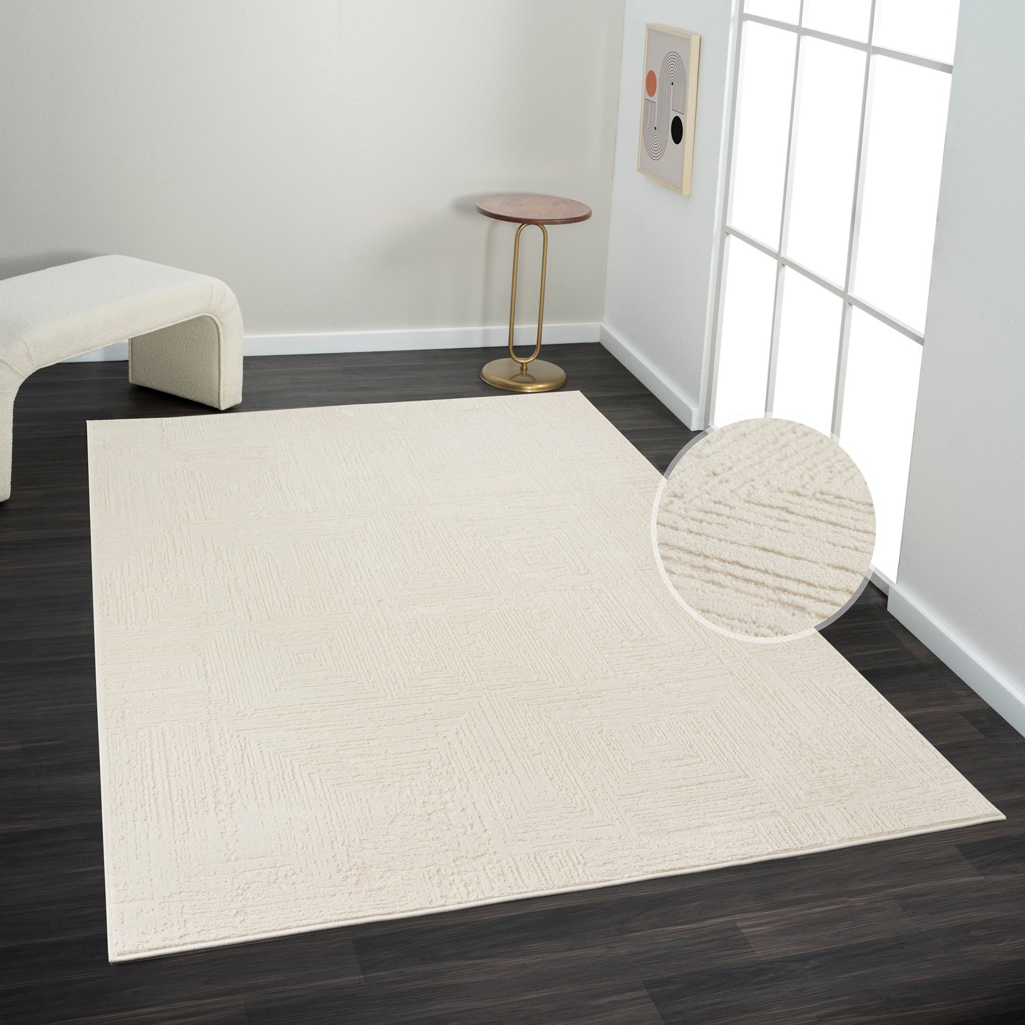 Hinweis Material | Bitte saugen Sie den Teppich immer nur mit einer Flachdüse, ohne den Einsatz von Bürsten, so erhalten Sie die schöne Optik. |