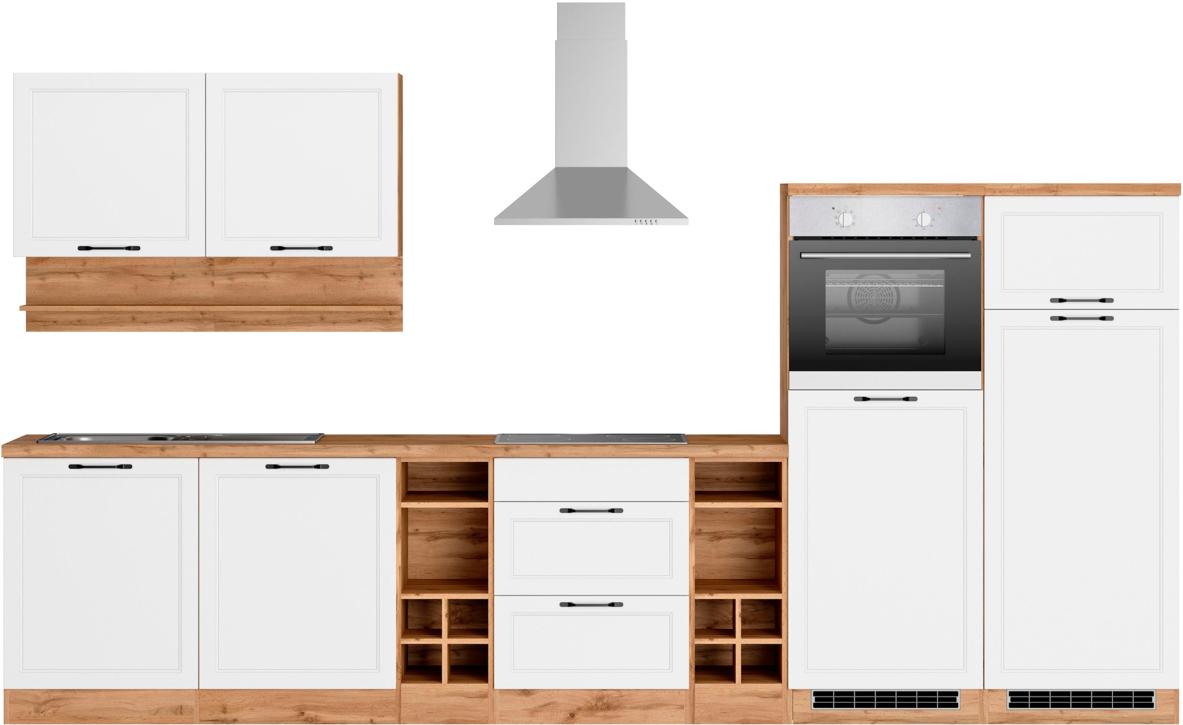 Ausstattung | Durchgehende Arbeitsplatte, Einlegeböden höhenverstellbar, Laufleisten der Schubkästen aus Metall, Metallgriffe, inkl. Edelstahl-Auflagespüle, mit Abtropffläche, ohne E-Geräte |