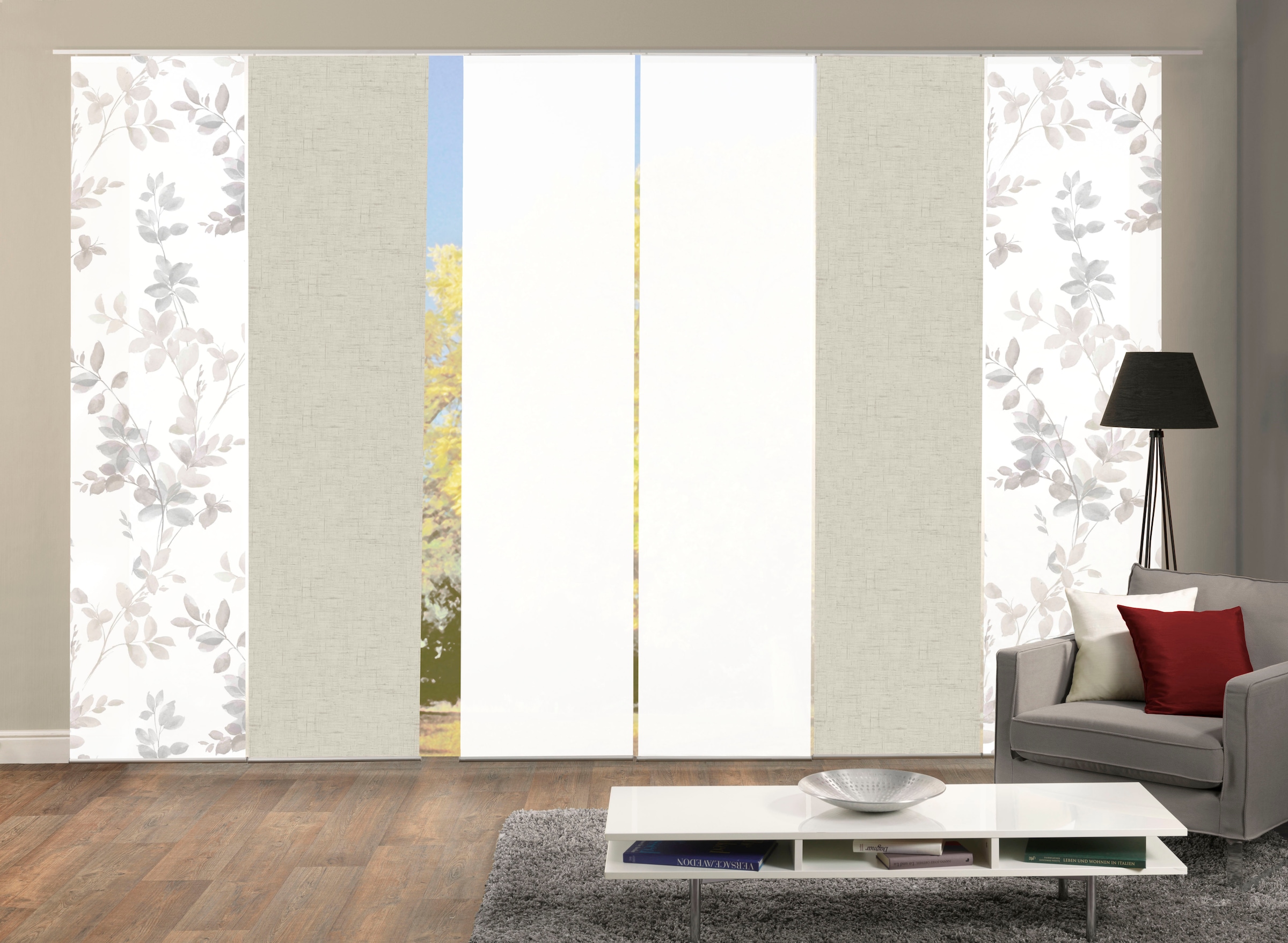 Hinweis Dekoration | Die angegebenen Maße sind die fertig dekorierten Maße.;Eine Schiebegardine ist eine schmale, glatt hängende Stoffbahn, die sich sowohl als Sichtschutz als auch zur Raumteilung eignet. Durch die Schiebetechnik sind Schiebegardinen sehr flexibel einsetzbar. |