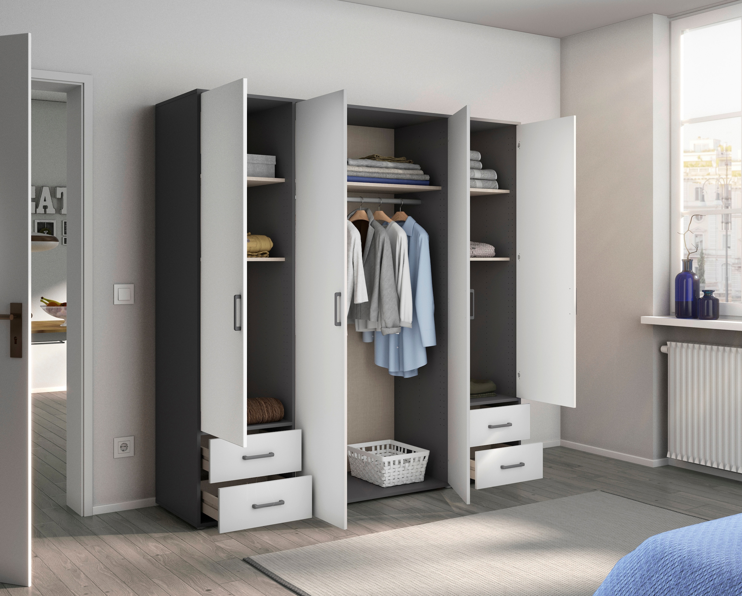 - Fachböden und Kleiderstangen im Kleiderschrank können individuell eingesetzt und in der Höhe verstellt werden