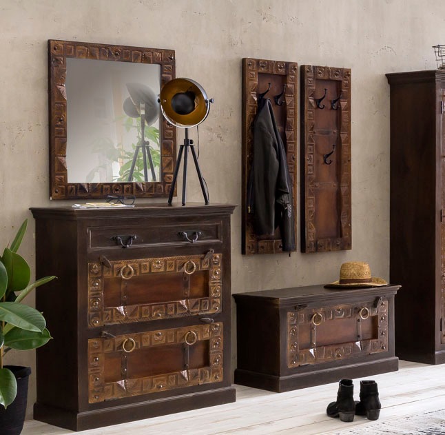 Set beinhaltet | 1 großer Schuhschrank, 1 kleiner Schuhschrank, 2 Garderobenpaneele, 1 Spiegel |