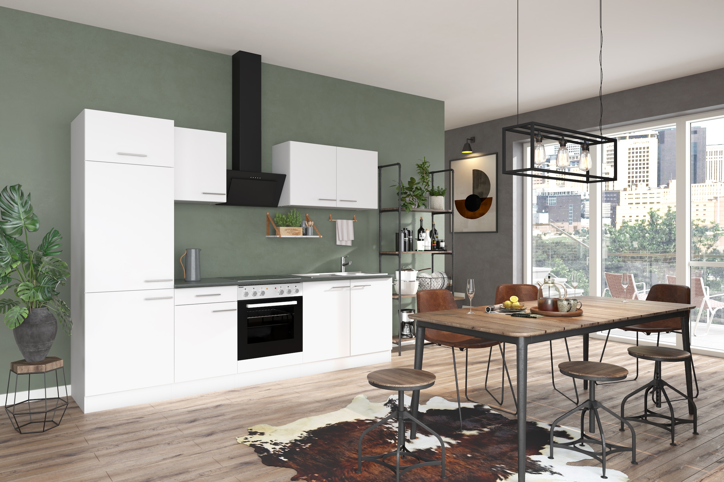 Ausstattung | Durchgehende Arbeitsplatte, Einlegeböden höhenverstellbar, Laufleisten der Schubkästen aus Metall, Metallgriffe, Seitenverkehrt stellbar, Sockelhöhe nicht verstellbar, Türen wahlweise rechts/links montierbar, inkl. Edelstahl-Einbauspüle, mit Abtropffläche |