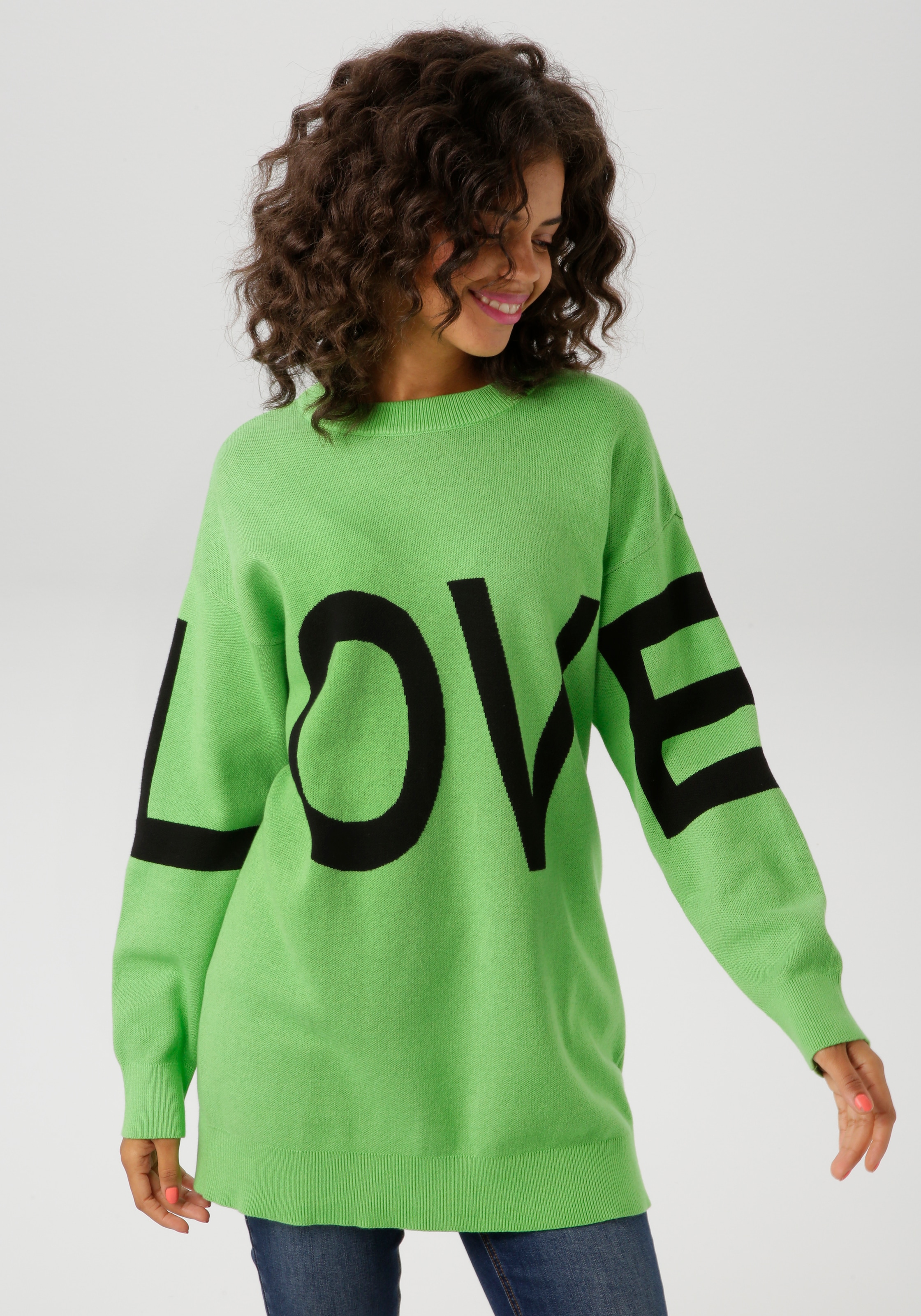 "Liebevoller" Pullover in trendiger Farbpalette von Aniston CASUAL. Mit eingestricktem LOVE-Schriftzug. Rundhals-Ausschnitt, überschnittene Schultern und lange Ärmel. Oversized, sehr weiter Longpullover. Länge in Gr. 36 ca. 70 cm. Weicher Jacquard-Strick. Unterstützt Cotton made in Africa. Reine Baumwolle. Maschinenwäsche.