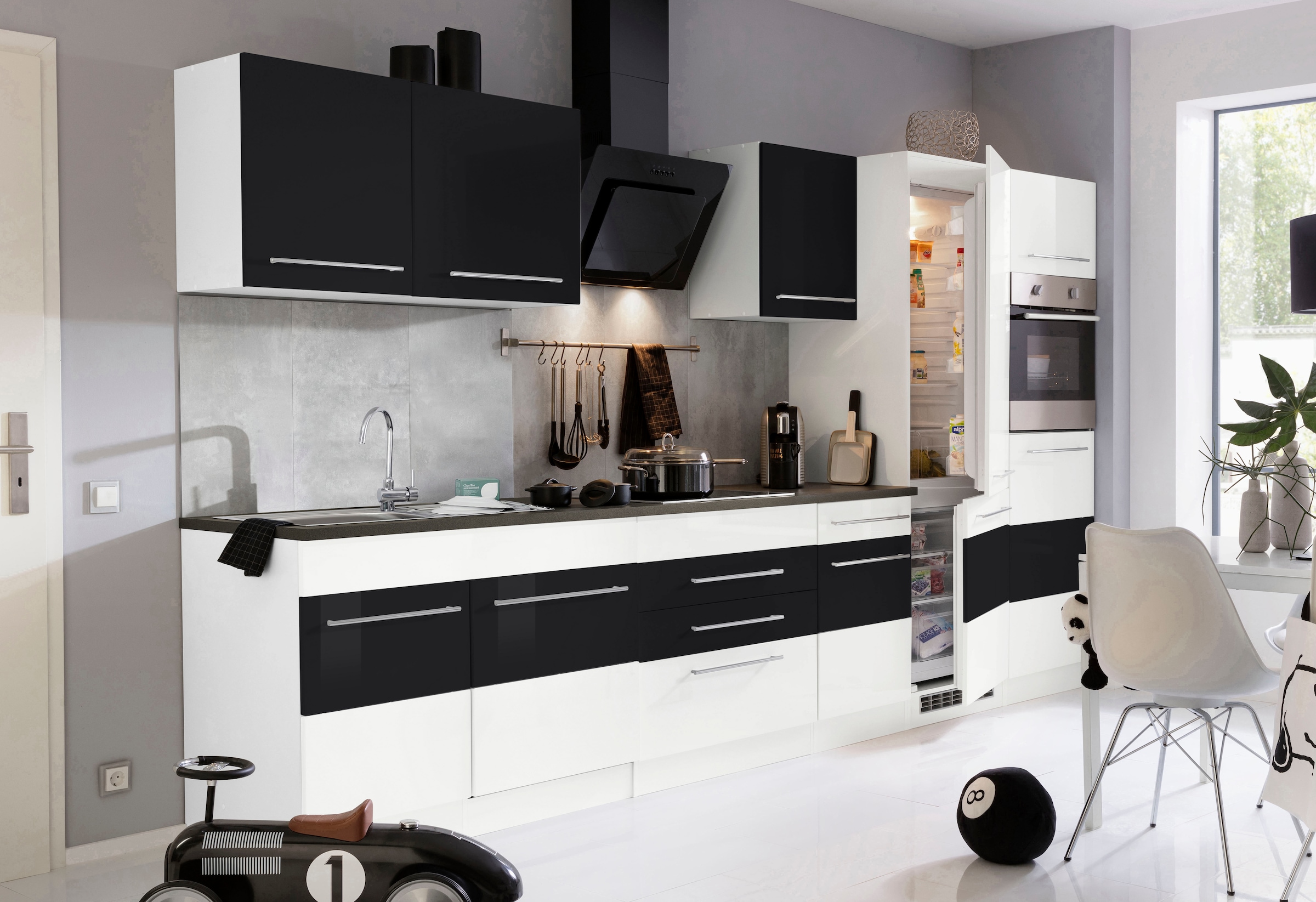 KOCHSTATION Küchenzeile »KS-Lagos, Breite 360 cm, wahlweise mit E-Geräten« Ceran-oder Induktionskochfeld, Spüle edelstahl oder schwarz