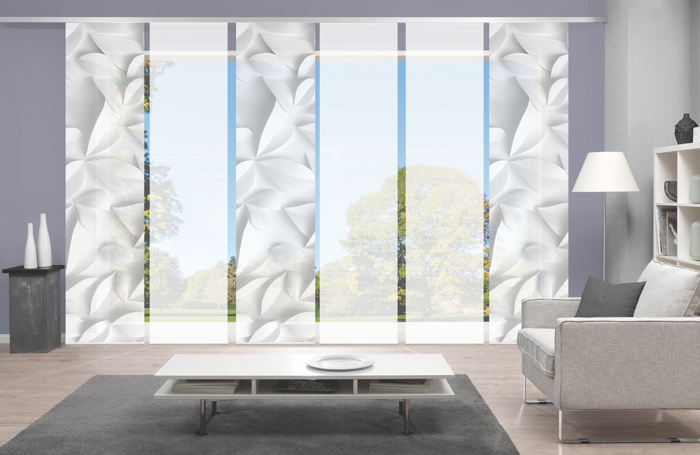 Hinweis Dekoration | Die angegebenen Maße sind die fertig dekorierten Maße.;Eine Schiebegardine ist eine schmale, glatt hängende Stoffbahn, die sich sowohl als Sichtschutz als auch zur Raumteilung eignet. Durch die Schiebetechnik sind Schiebegardinen sehr flexibel einsetzbar. |
