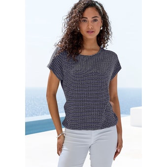 Langärmeliges Strickshirt mit Jacquardmuster in Streifenoptik von Lascana. Rundhalsausschnitt. Elastikbund. Trageangenehme Qualität mit Viskose aus verbesserter Rohstoffbeschaffung.