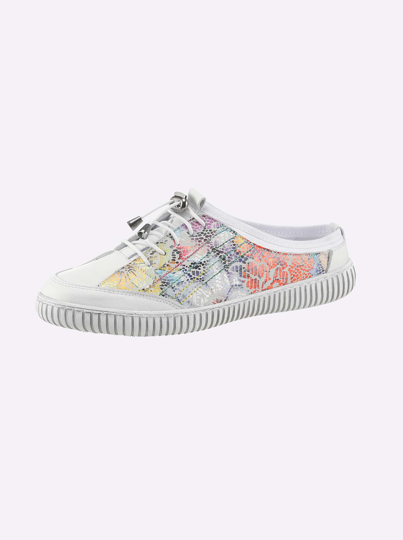 Schnell mal reingeschlüpft sind Sie in diesen in allen Regenbogenfarben schimmernden Slipper mit elastischen Schnürsenkeln. Obermaterial und Innensohle aus Glattleder, textiles Innenfutter. Weich gepolstert für angenehmen Laufkomfort. Rutschhemmende TR-Laufsohle. Absatzhöhe ca. 25 mm. Weite G.