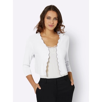 Dieser Bolero passt perfekt zu festlichen Anlässen und lässt sich wunderbar zu Kleidern und Röcken kombinieren. Mit schmückender Zierspange am Rundhals-Ausschnitt. 3/4-lange Ärmel. Aufwendig passformgerecht in Form gestrickt. In edlem Feinstrick. Viskose in ECOVERO-Qualität von Lenzing. 70% Viskose (ECOVERO), 30% Polyamid. Maschinenwäsche.
