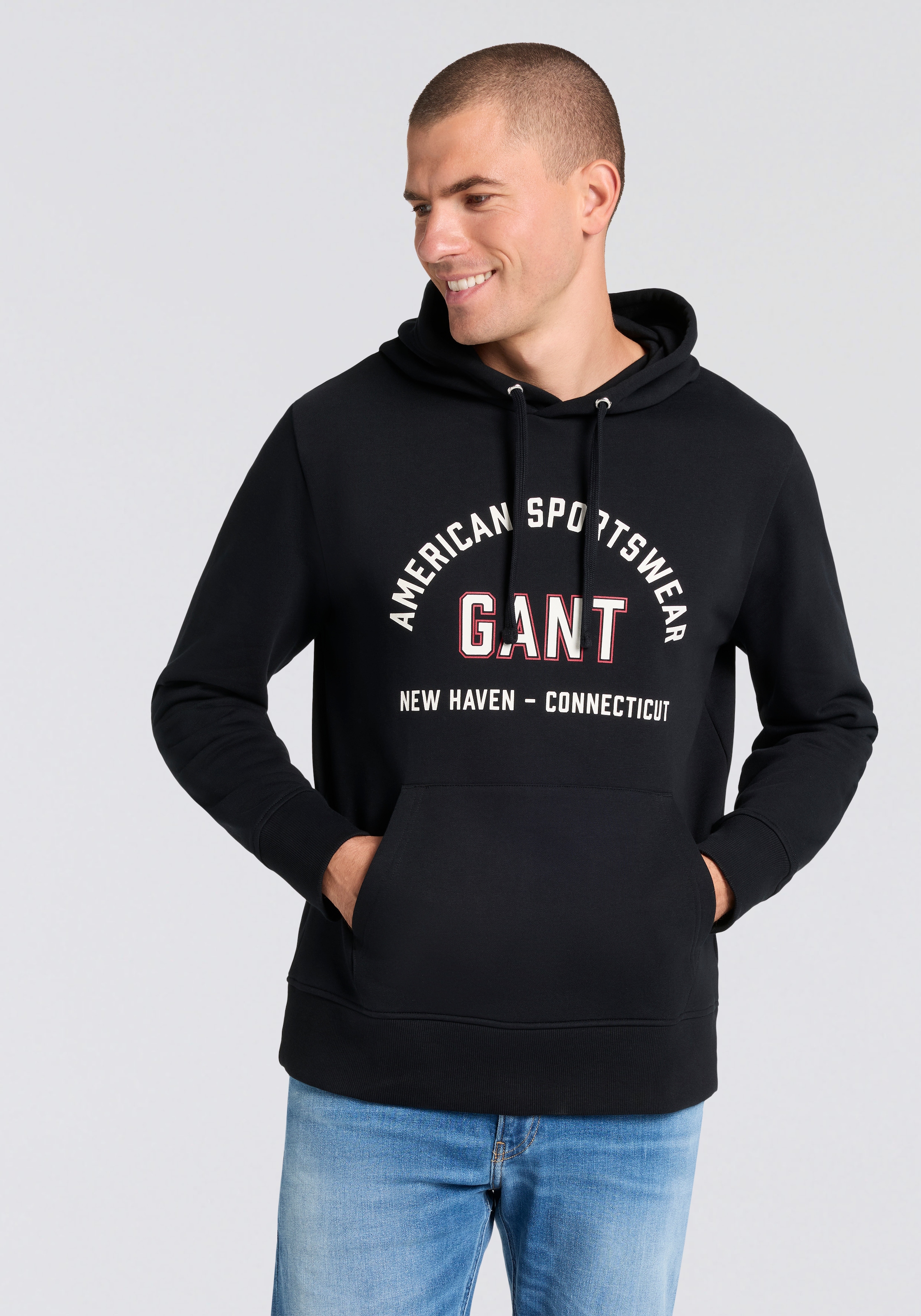 Kombistarkes Herren-Sweatshirt der Marke Gant. Mit einem normalen Schnitt. Die Ärmel sind lang. Außerdem hat das Sweatshirt eine praktische Kapuze. Dank des weichen und dehnbaren Sweatstoffs macht das Oberteil jede Bewegung mit.