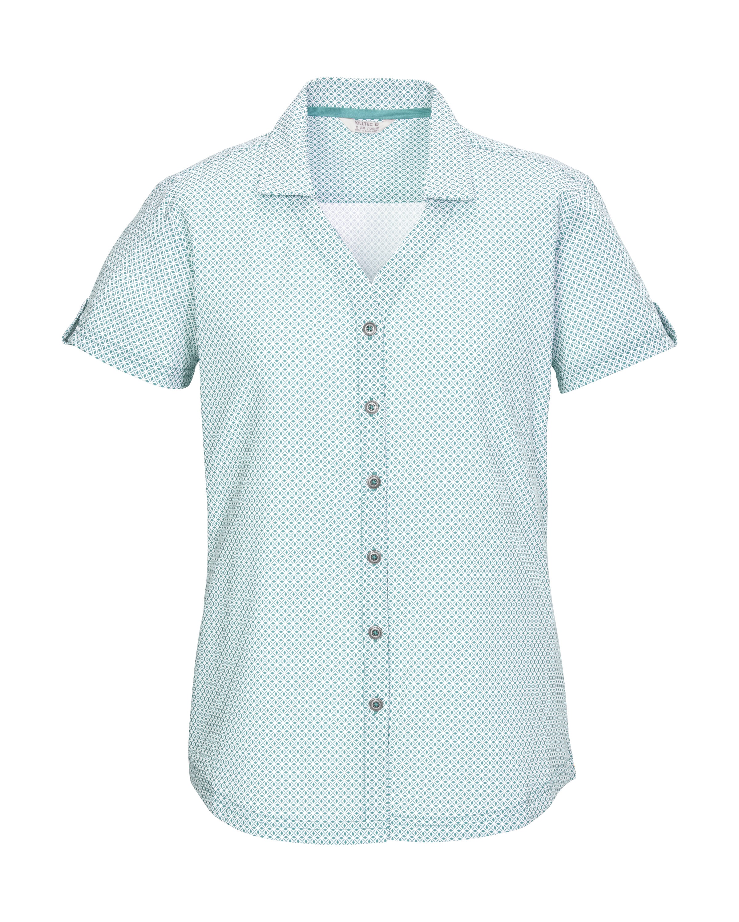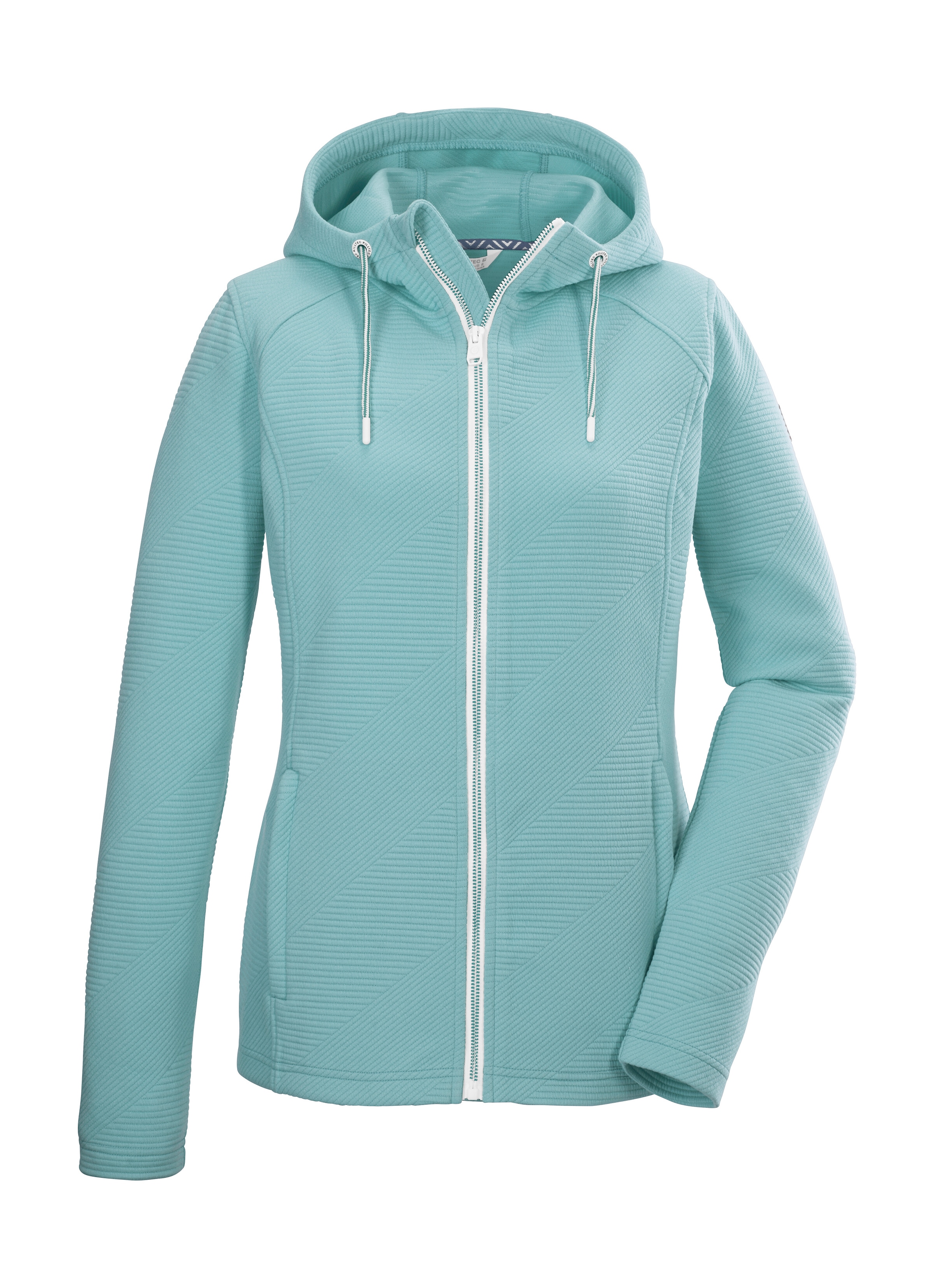 Die killtec Damen Softshelljacke mit geometrischem All Over-Muster begleitet zuverlässig bei Wind und Wetter. Sie ist mit einer Wassersäule von 10.000 mm wasserabweisend und winddicht. Gleichzeitig ist sie atmungsaktiv mit einer Wasserdampfdurchlässigkeit von 3.000 g/m²/24 h. Die Kapuze ist regulierbar und bei Bedarf abzippbar. Der Saum lässt sich mithilfe eines Kordelzuges regulieren und die Ärmelbündchen sind durch Klettverschlüsse verstellbar. Der Frontreißverschluss ist mit einem Kinnschutz versehen, der die Haut vor dem Einklemmen schützt. Die zwei Seitentaschen und die Brusttasche lassen sich mit Zippern verschließen, sodass nichts verloren geht. Die Jacke ist mit der leistungsstarken, regenerativen Ausrüstung Teflon EcoElite™ imprägniert. Dieses Textilrepellent ist pflanzenbasiert und hat eine nicht fluorierte Fleckschutztechnologie, die Wasser- und wasserbasierte Flecken abweist.