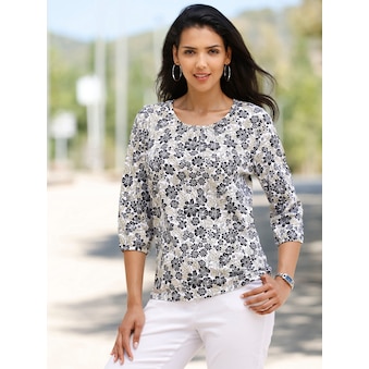 Hahnentritt und silberfarbener Folien-Print – eine aufsehenerregend schöne Kombination! Rundhals-Ausschnitt, im Vorderteil bedruckt (??), mit 3/4-Ärmeln. 100% Baumwolle. Maschinenwäsche.