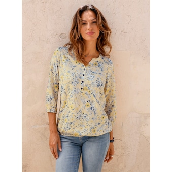 Druckbluse mit effektvoller Musterung in Reptilienoptik - jedes Teil ein Unikat! Besonderer Blickfang: Der feminine Rundhalsausschnitt wird von kleinen Fältchen, Schlitz und einem hübschen Zierelement betont. Mit elastischen Ärmelbündchen und Kellerfalte im Rückteil. Hochwertige, fließende Viskose. Länge ca. 66 cm in Gr. 46, ca. 62 cm in Gr. 23. Unser Model ist 180 cm groß und trägt Größe 38