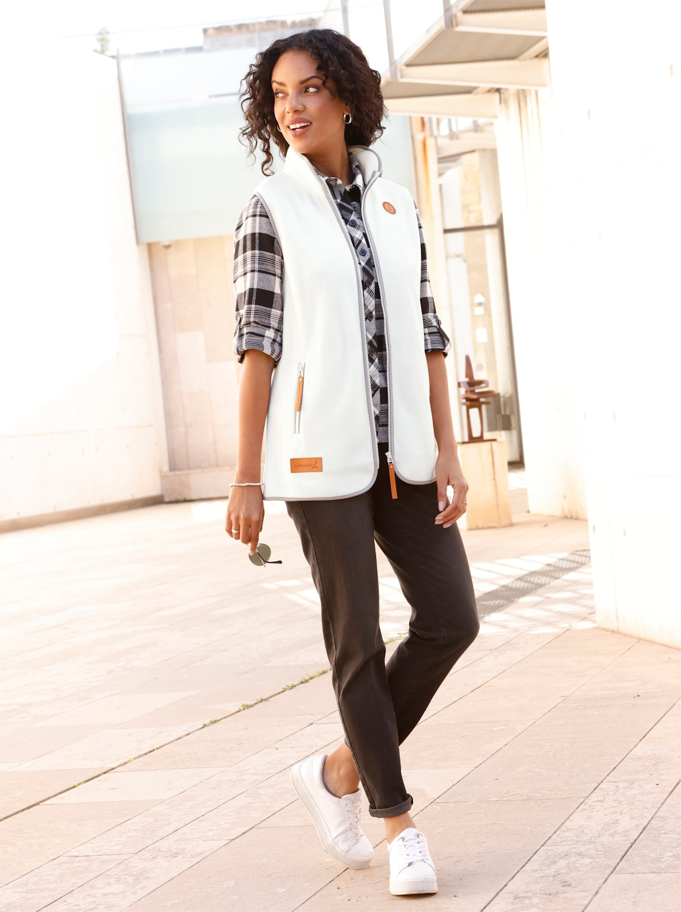 Jerseyweste in herrlich leichter Qualität. Streckende Overlocknähte aus Glanzgarn akzentuieren die außergewöhnliche Strukturware. Mit kleinem Stehkragen und Reißverschluss. Die hochwertige Verarbeitung zeigt sich nicht zuletzt auch auf der Innenseite: Nähte sind fein versäubert und Belege in glatter Ton-in-Ton-Jerseyware gearbeitet. Für beste Passform sorgen Teilungsnähte, in die Taschen eingearbeitet wurden. Waschen-Trocknen-Anziehen-Qualität. Länge ca. 69 cm in Gr. 46, ca. 65 cm in Gr. 23.
