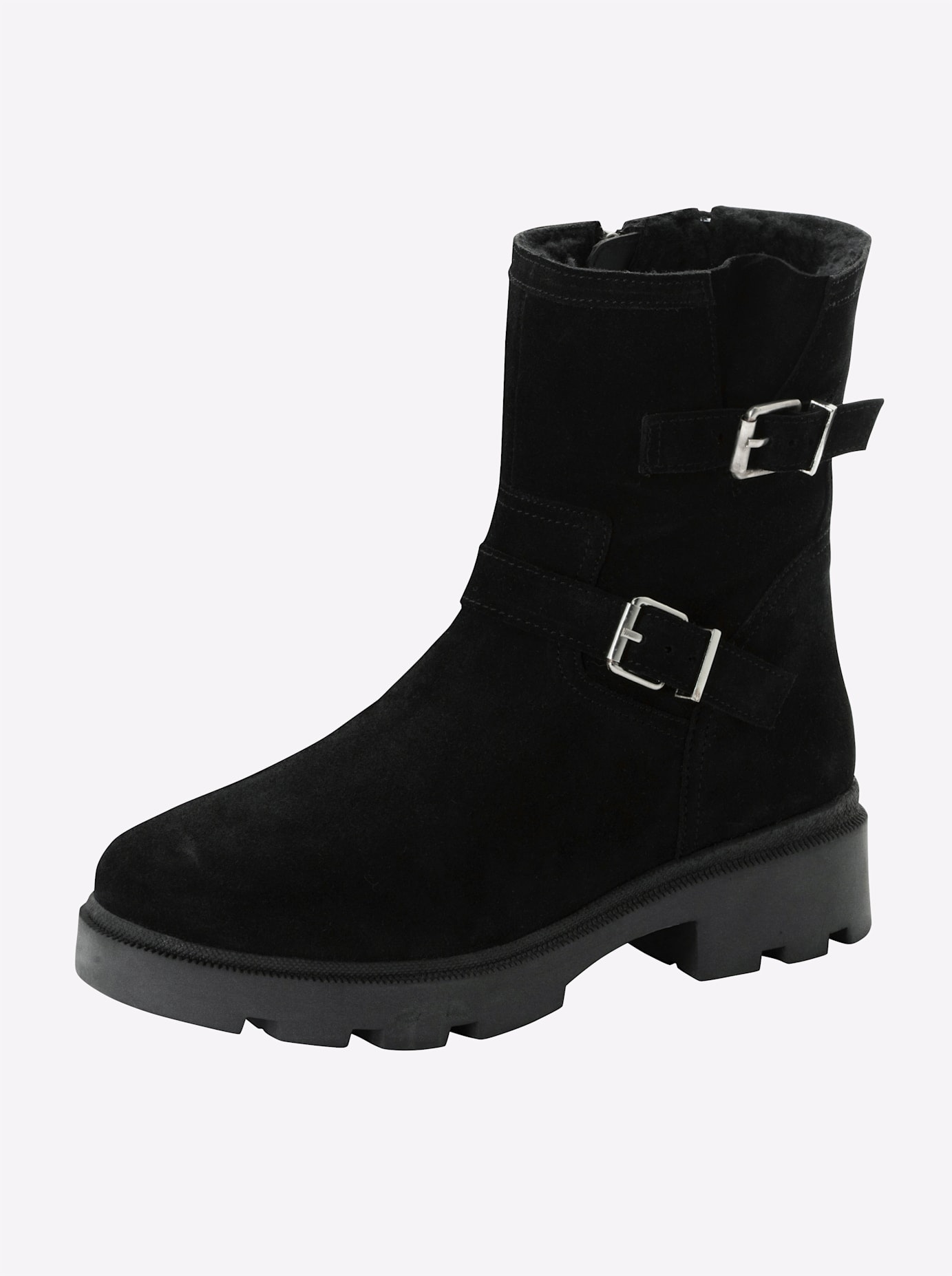 Stiefelette aus Nubukleder. Für modische Coolness sorgen die markanten Schnallenbänder, die für mehr Bequemlichkeit in der Weite verstellt werden können. Zu schließen sind die Boots mit einem Reißverschluss, die leicht profilierte Laufsohle unterstreicht den lässigen Look.