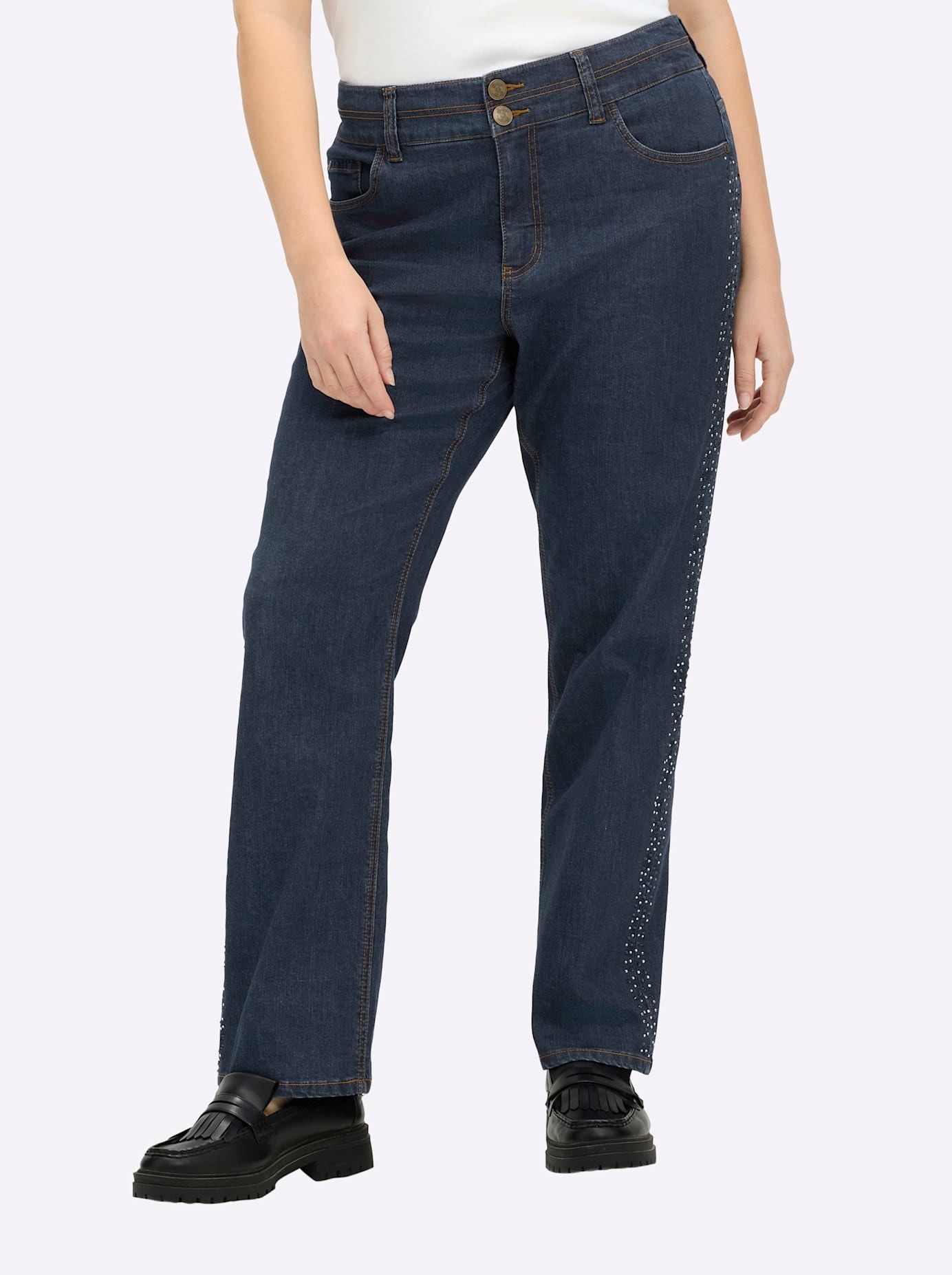 Gerade Jeans im Curvy-Schnitt MANUELA, bei schmalerer Taille und kräftigen Oberschenkeln. Für den femininen Twist ist die Hose seitlich mit Glitzersteinchen verziert. Dazu kommen Formbund, Gürtelschlaufen, zwei Knöpfe und Reißverschluss. Der Five-Pocket-Stil mit runden Taschen vorn.