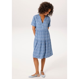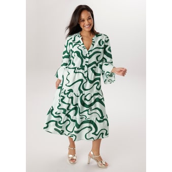Modisches Kleid von Aniston PLUS. Mit Volant an den 3/4-langen Ärmeln und am Saum. Dekorativer V-Ausschnitt mit Knopfleiste. Wadenlanges, lässig geschnittenes Midikleid. Länge in Gr. 46 ca. 116 cm. Aus weich fließender Viskose-Polyamid Qualität. Maschinenwäsche.