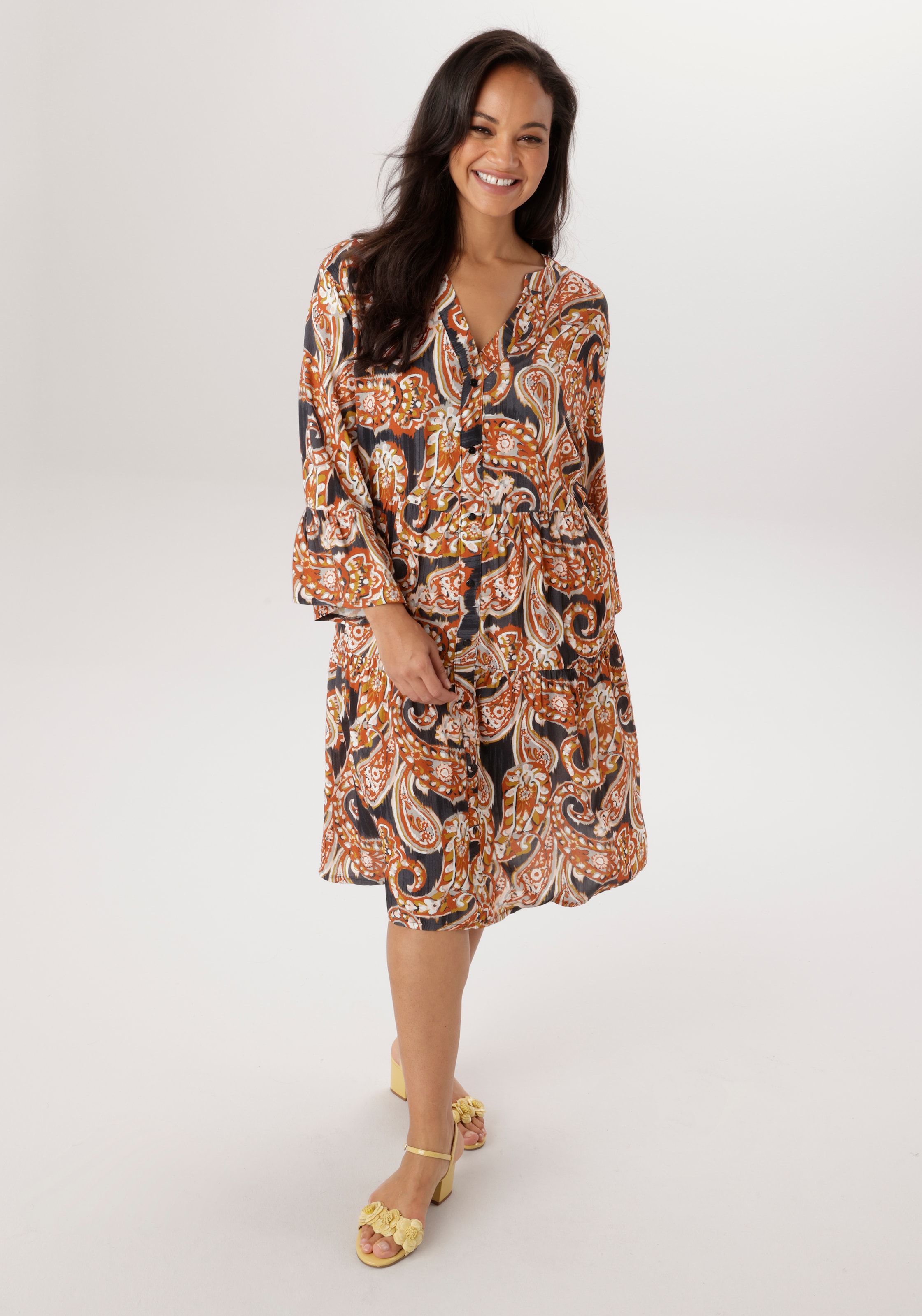 Trendiges Kleid von Aniston PLUS. Im Animal - Dessin. Durchgehende Knopfleiste und zwei seitlichen Eingrifftaschen. Mit 3/4 langen Krempel-Ärmeln. Figurumspielendes Hemdblusenkleid. Länge in Gr. 46 ca. 100 cm. Aus Leinen-Viskose Qualität. Maschinenwäsche.