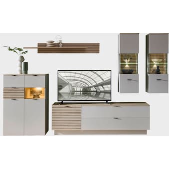 - Die Wohnwand kombiniert Cashmere und Riva Eiche. Lamellenoptik und schwarze Griffe setzen dezente Akzente, während FSC zertifiziertes Holz für Qualität steht.