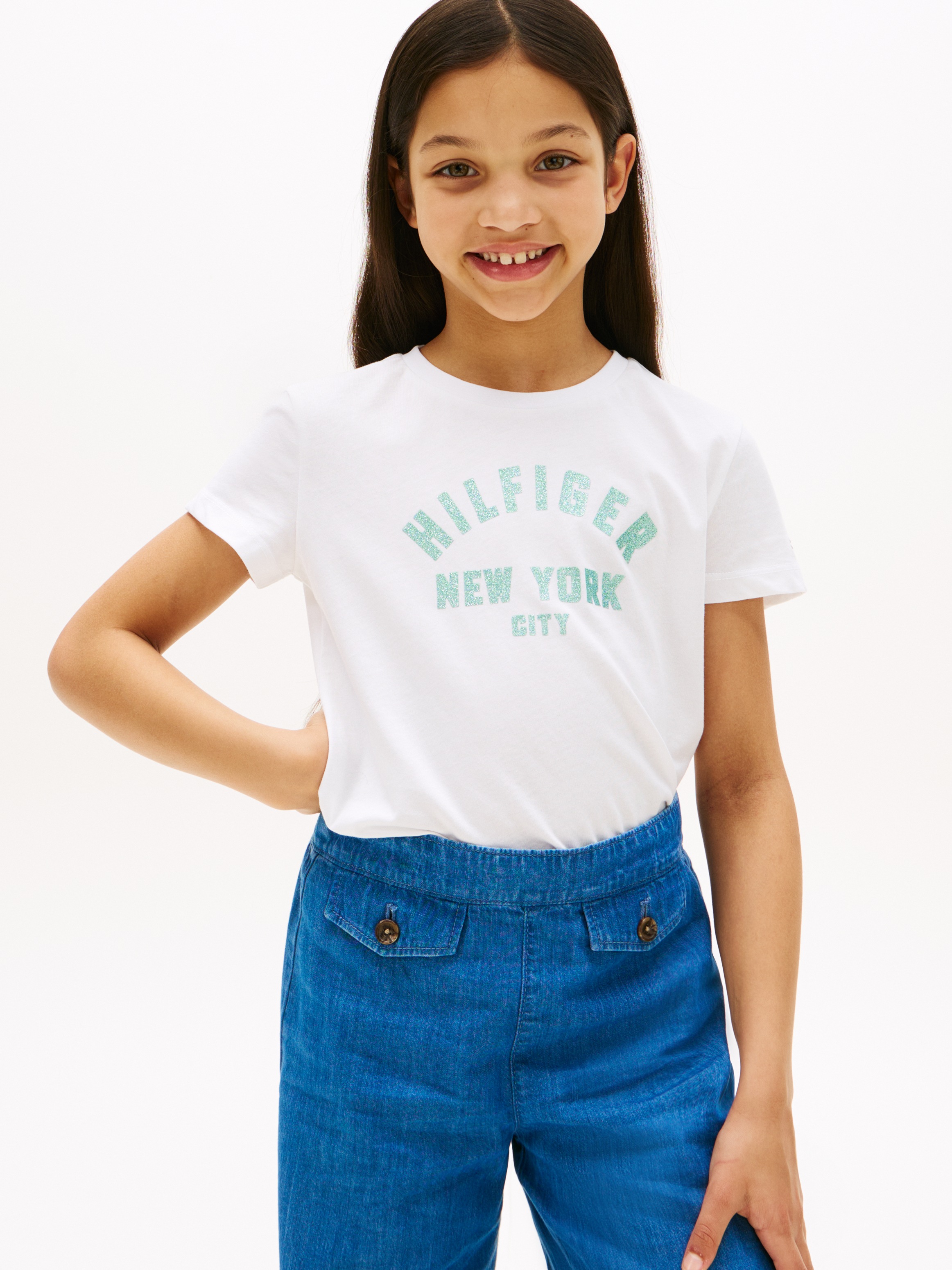 T-Shirt für Mädchen 4-16. Die Eigenschaften dieses Produkts sind: Stoff: Baumwoll-Jersey 140 g/m2, Waschung: Stückgefärbt- und Biowaschung, Passform: Regular Fit, Hals: Rundhalsausschnitt und Großer Vintage-Siebdruck auf der Vorderseite und auf der Vorderseite und Rückseite in der Farbe Egret.