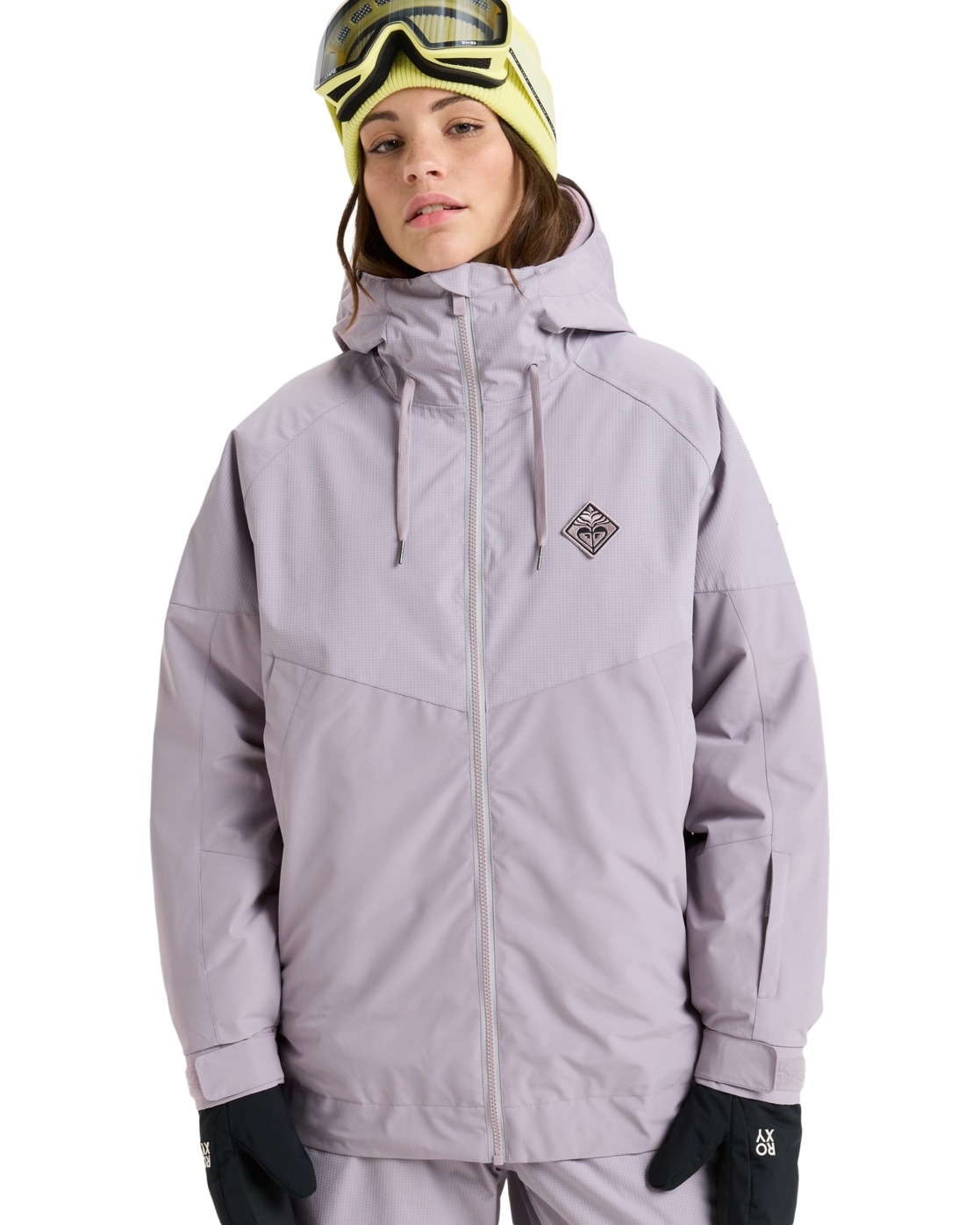 Funktionelle Snow-Jacke für Frauen. Die Eigenschaften dieses Produkts sind: Technologie: 10K ROXY DryFlight-Imprägnierung [10.000 mm / 10.000 g] für bessere Wasserdichtigkeit und Atmungsaktivität, Wärme: ROXY WarmFlight X2 Geringes Volumen, leichte, atmungsaktive Isolierung, Isolierung: 100 % Kunstdaune [Füllgewicht: 130 g], Passform: Relaxed Fit, lockere Passform mit überschnittenen Schultern für Komfort und Stil, ÖKO-MASSNAHMEN: PFAS-freie Imprägnierung, Außenmaterial: 57 % Nylon, 43 % Polyester-Leinwandbindung, Nähte: Nahtverklebung an kritischen Stellen, Futter: Leichtes Taft mit gebürstetem Trikot-Stoff für Wärme und Atmungsaktivität, Kapuze: Auf 3 Arten verstellbare, feste Kapuze mit Kordelzug, Schneefang: Fester, verstaubarer Schneefang aus Taft mit Befestigungsystem für Jacke und Hose, Taschen: 2 Handwärmtaschen mit Reißverschluss und Schlüsselclip, Skipasstasche im Ärmel, Belüftung: Mit Mesh gefütterte Belüftungsöffnungen unter den Armen zur Temperaturregulierung, Bündchen/Manschette: Innere elastische Handgelenkgamaschen, elastisches Ärmelbündchen mit Versteller und Saumweitenversteller in der Eingrifftasche.